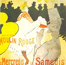 В 80-е и 90-е годы здесь одно за другим открываются кабаре — "Элисе-Монмартр", "Мерлитон", "Мулен-де-ла-Галетт","Японский Диван" и конечно "Мулен Руж" — где публика могла танцевать или, сидя за столиками кафе, смотреть на профессиональных танцоров и слушать песенки модных певцов. Именно актеры кабаре и их зрители, состоявшие из художественной богемы, простого люда и представителей самого дна большого города, стали главными персонажами Лотрека. С 1889 по 1892 год художник создает серию картин, в которых как бы фиксировалась под разными углами зрения жизнь монмартрских кабаре.