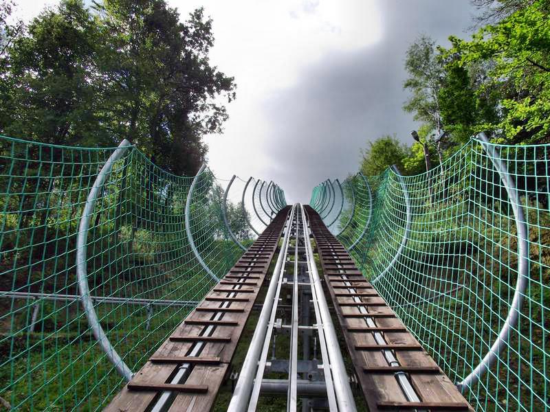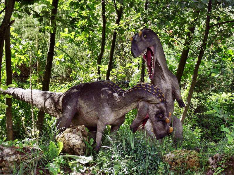 Между прочим, тот самый аллозавр, который первым здесь наследил, имеет зубки длиной сантиметров в семь. Так, что лучше переходить на бодрый аллюр, пока вот тот тиранозавр занят разборками со своими сородичами. Да сколько их тут! Говорят, что более 70 самых разных размеров и наклонностей. Вот кто-то не успел увернуться. Невольно появляется мелкая дрожь, и стиль сменяется на крупную рысь.Глаза ищут возможные средства спасения. Может попробовать на той штуковине? Называется она роллеркостер. И действительно очень шустро мчится по извилистой рельсовой дороге. Вот только возвращается на место своего старта. Так что снова бегом, к симпатичному ярко желтому автобусу.