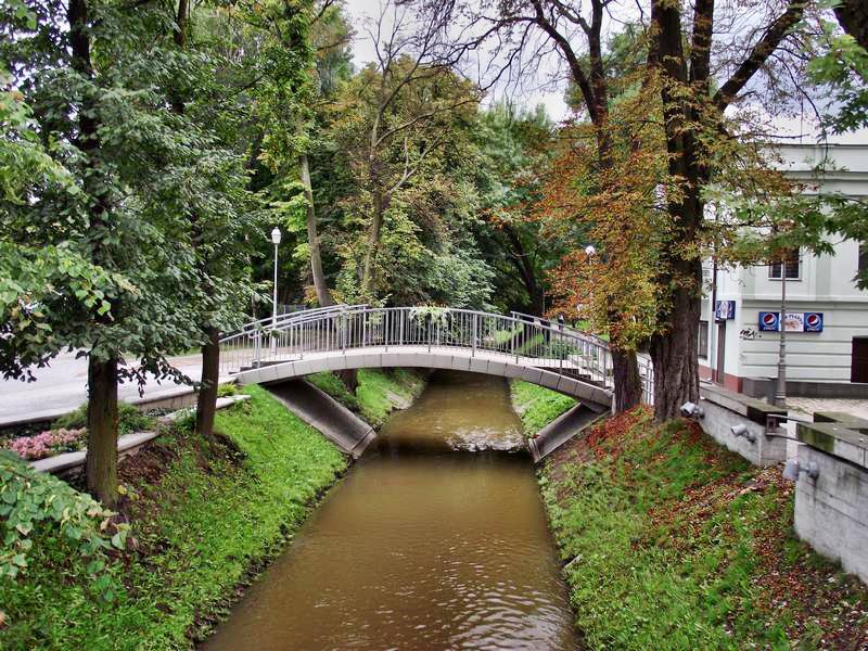 От площади узенькая тенистая улочка выводит к замковой горе и кафедральному собору. За ним небольшой уютный парк с озером и какой-то безымянной речушкой. И… снова отель. С его верхних этажей видна большая часть города. Правда немного портит вид огромная труба. А вообще Кельце как бы символично можно вложить между двух гор. С одной стороны гора Каржовка, на вершине которой возведен монастырь бернандинцев. С другой – гора Халаса с телевышкой. Своеобразная нить времен.