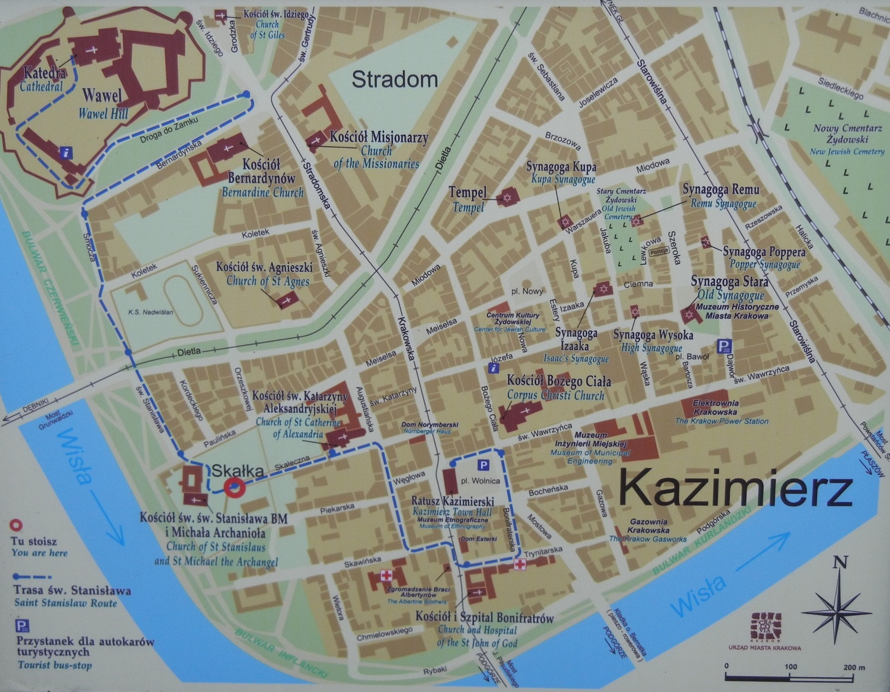 Добравшись по Градской улице до Вавельского замка и осмотрев кафедральный собор святых Станислава и Вацлава – местом коронации и последнего успокоения польских королей, который находится на его территории, можно отправиться в район Кракова под названием Казимеж, расположенный за пределами исторического центра города. Для этого нужно пройти по улице Страдомской, которая, пересекая проспект Йозефа Детла, уже именуется Краковской. Небольшой переулок святой Катаржины приведет нас к одноименному готическому костелу, который был возведен монахами Ордена августинов в XIV веке.