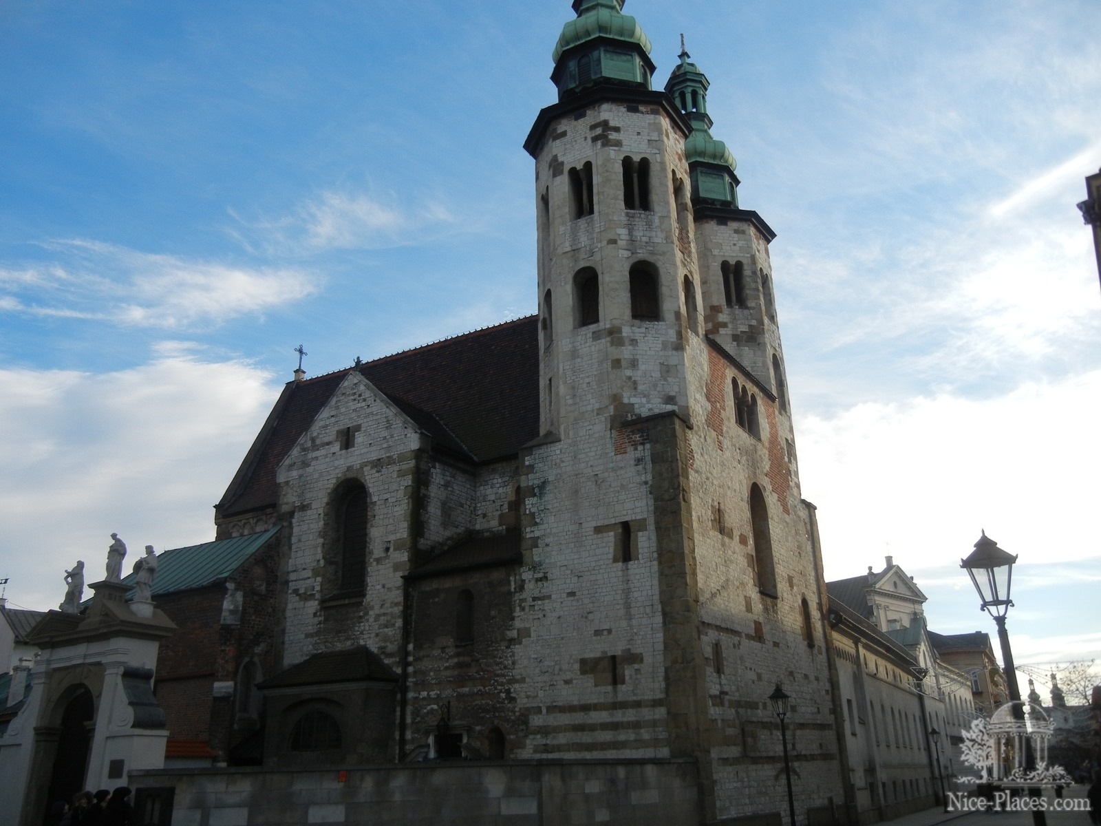 Вернувшись на улицу Градскую, продолжим прогулку по ней. Почти в самом конце улицы мы увидим строгое, величественное здание церкви из белого камня, на котором видны вкрапления кирпичной кладки. Это костел святого Андрея – один из самых древних храмов города. Он был воздвигнут в конце XI столетия в романском стиле. Вдохновителем строительства костела выступил намесник верховного правителя воевода Окул. В начале XIII века костел перестроили. Вероятно, во время той реконструкции храм был украшен двумя башнями, которые сейчас увенчаны барочными куполами.