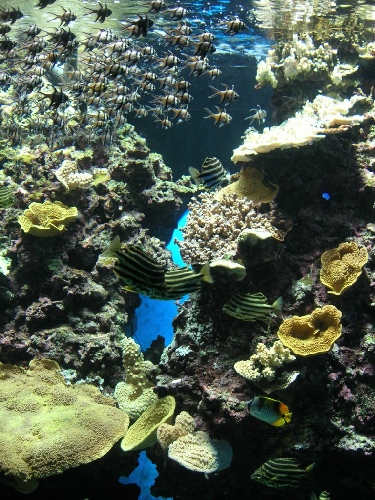 В Океанографическом музее можно в деталях изучить все моря нашей планеты. Но особого внимания заслуживают тропические акватории, пестрящие огромным разнообразием флоры и фауны. Одним из самых интересных экспонатов является коралловый риф, состоящий из живых кораллов, доставленных сюда из Красного моря. Чтобы рост кораллов не прекращался днем на аквариум всегда падают солнечные лучи. Всего в аквариумах музея представлено более пяти сотен обитателей моря, от самых безобидных рыбешек до опасных хищников, таких как акулы.