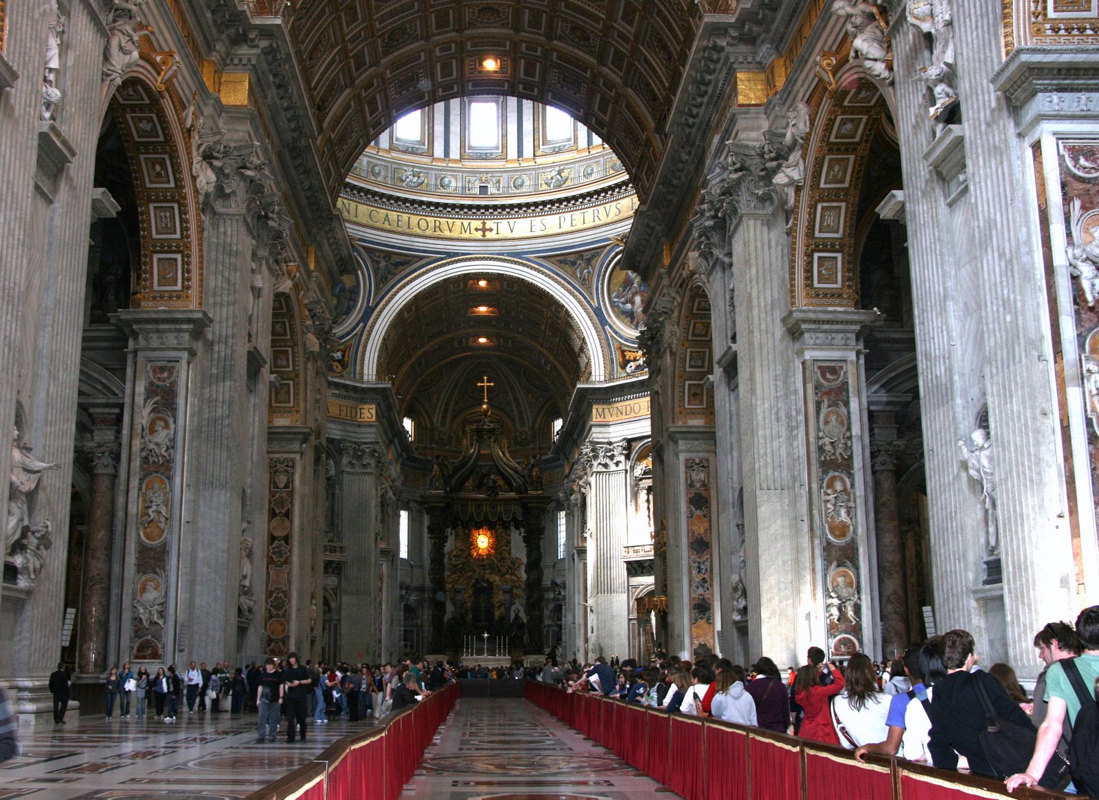 К собору ведет широкая главная лестница. У ее основания стоят огромные статуи апостолов Петра и Павла. Пройдя ко входу в храм по правой стороне площади, вы окажетесь у колоннады Бернини. Сквозь открытые двери в глубине видна лестница. В этом гениальном творении Бернини использовал эффект оптической иллюзии, благодаря которому снизу лестница кажется значительно длиннее, чем есть на самом деле, а когда на верхней площадке появляется папа – он кажется неожиданно большим и величественным.