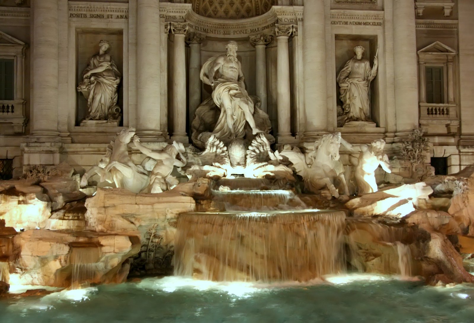 Недалеко от Испанской лестницы находится Фонтан Треви – самый знаменитый фонтан в Риме, построенный архитектором Н.Сальви по эскизам Бернини. Небольшая площадь вокруг фонтана напоминает амфитеатр, заполненный зрителями, а сам фонтан – сцену, по центру которой мы видим бога Океана в повозке-раковине. Дно фонтана устлано монетами: по старому поверью, гости города, желающие снова вернуться в Рим, должны бросить в фонтан монетку, правой рукой через левое плечо, стоя спиной к фонтану. Но есть и еще одна традиция у туристов – нужно сделать несколько глотков воды из «трубочек влюбленных», расположенных в правой части фонтана.