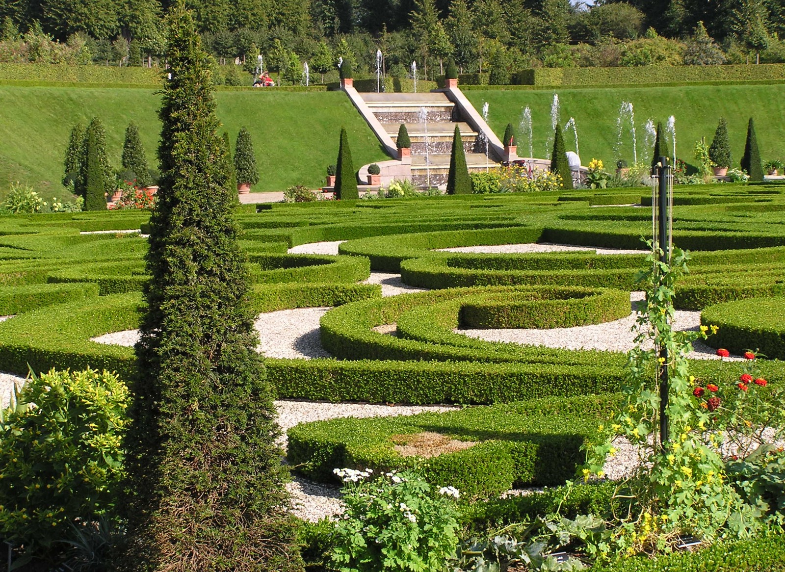 Для посещения парк открыли в 1996 году. Здесь можно увидеть великолепный водный каскад со множеством каналов и фонтанов. Из кустов самшита (а их здесь без малого 65 тыс.) «сооружены» четыре королевские монограммы. Столь витиеватое переплетение зеленых насаждений многие часто принимают за лабиринт, но на самом деле это сложный узор из самшита, круглый год поддерживаемый профессиональными садовниками парка. Рассматривая самшитовые узоры из окон верхнего этажа замка, в этом можно убедиться воочию.
