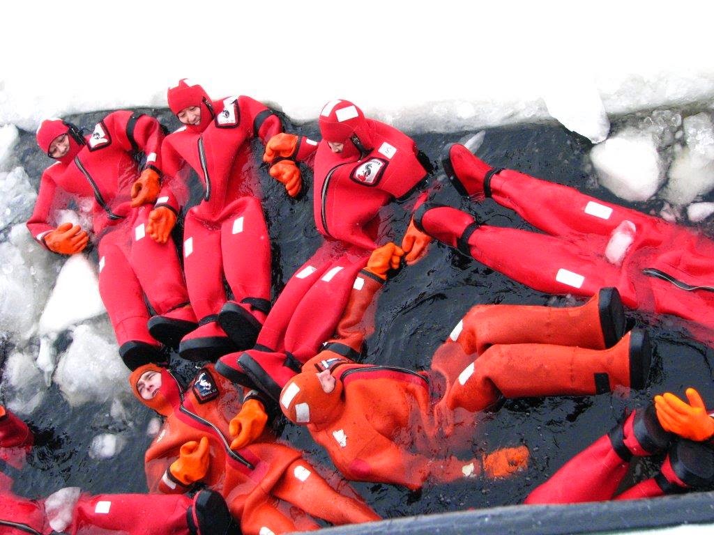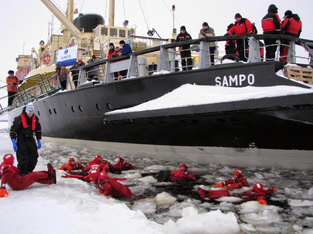 Однако самое захватывающее происходит, конечно, на палубе. Глупо все четыре часа, а именно столько продолжается стандартный круиз по Ботническому заливу, просидеть в тепле салона. Большинство туристов заворожено наблюдают за тем, как ломается лед под весом корпуса ледокола, а самые смелые решаются искупаться в холодных водах. Температура воды равняется примерно нулю градусов. В такой воде без специального оборудования можно продержаться всего несколько минут. Но отважных туристов снабжают теплыми гидрокостюмами красного цвета, в которых можно барахтаться в ледяной воде гораздо дольше. Почти все финны уверены, что такое купание оздоравливает человека. Туристы радостно верят финнам, отважно ныряют в воды Ботанического залива и гоняются за отколовшимися льдинами. Оставшиеся на палубе восторженно смеются и фотографируют аттракцион невиданной смелости.