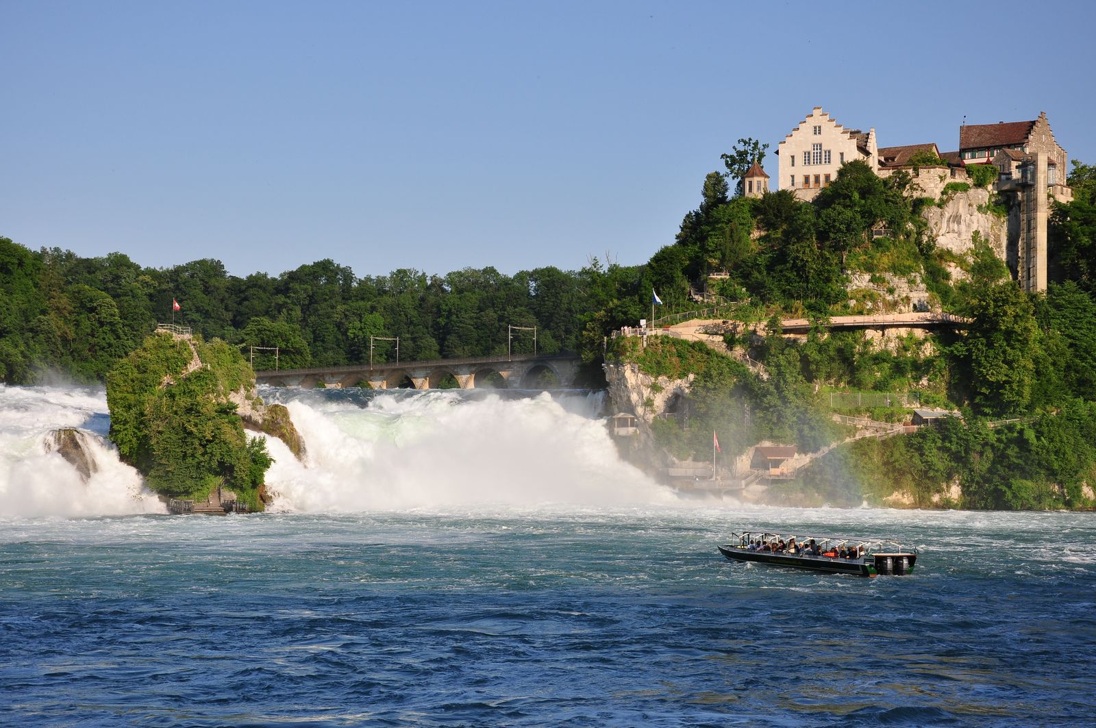 Насладиться необычайно красивым зрелищем Рейнского водопада можно с двух смотровых площадок. Первая, далеко выдвинутая в сторону реки, находится прямо за платформой электрички. Спускаясь сверху на нее, не можешь избавиться от ощущения, что этот дико ревущий поток воды в одно мгновение сметет тебя с лестницы и унесет в неведомые дали. Кстати, многие считают, что именно эта площадка позволяет пережить наиболее полную гамму ощущений от мощи Рейнского водопада. Однако вход на нее платный и обойдется вам в 5 швейцарских франков.
