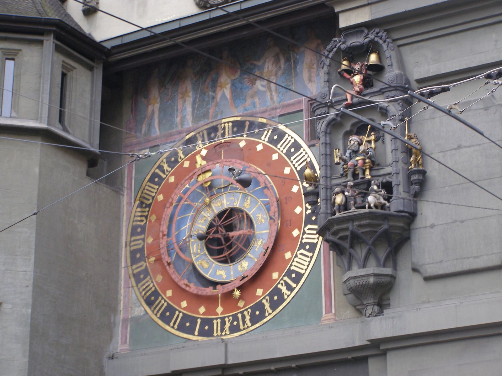 В нескольких шагах от Французской церкви можно увидеть еще одну значимую достопримечательность города – башню Цайтглокентурм. Это сооружение некогда было городскими воротами, которые охраняли въезд в город с западной стороны. В настоящий момент башня украшена часами, созданными К. Брукнером в 1530 году и с тех пор ни разу не подвергавшимися ремонту. Сложное устройство с ударным механизмом не только отсчитывает время, но и показывает день недели, знак Зодиака, положение Луны и Солнца. За 4 минуты до начала каждого часа по циферблату двигаются фигурки медведя — символа Берна, льва – геральдического животного основателя города Бертольда V Царингена — и петуха, возвещающего о победе добра над злом. В это же время шут звонит в колокола, а бог времени совершает манипуляции с песочными часами. Посмотреть на представление собирается множество туристов.