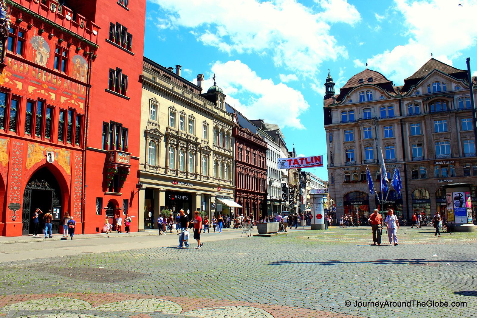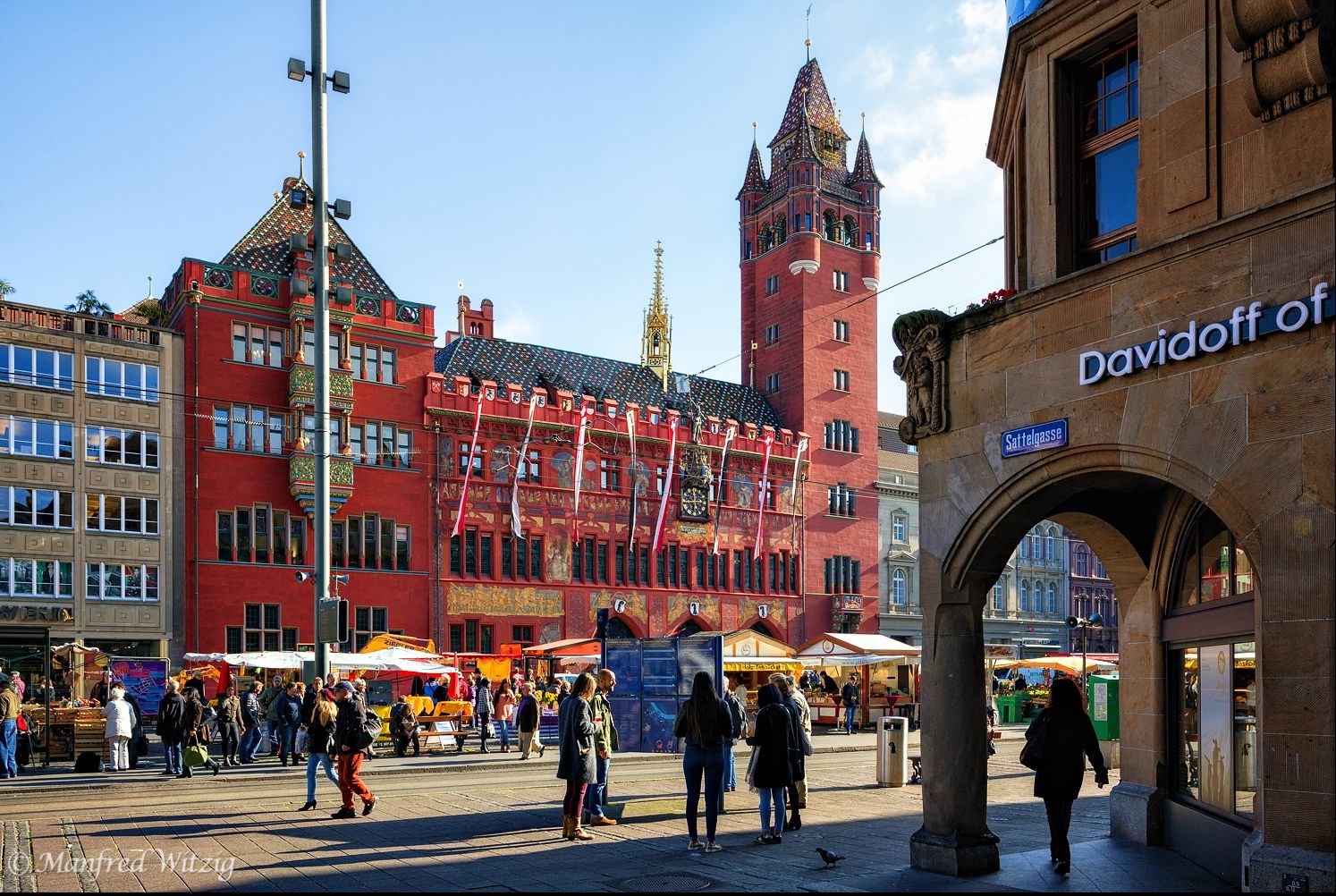 Проходим несколько сотен метров от собора и перед нами Marktplatz (Рыночная площадь). Взор восхищения сразу же прикован к городской ратуше с ярко-красным кирпичным фасадом, позолоченной колокольней и черепичной крышей. Здесь заседает правительство кантона Базель, ратуша открыта для публики. Здание строилось в начале ХVI века, после присоединения Базеля к Швейцарской конфедерации.