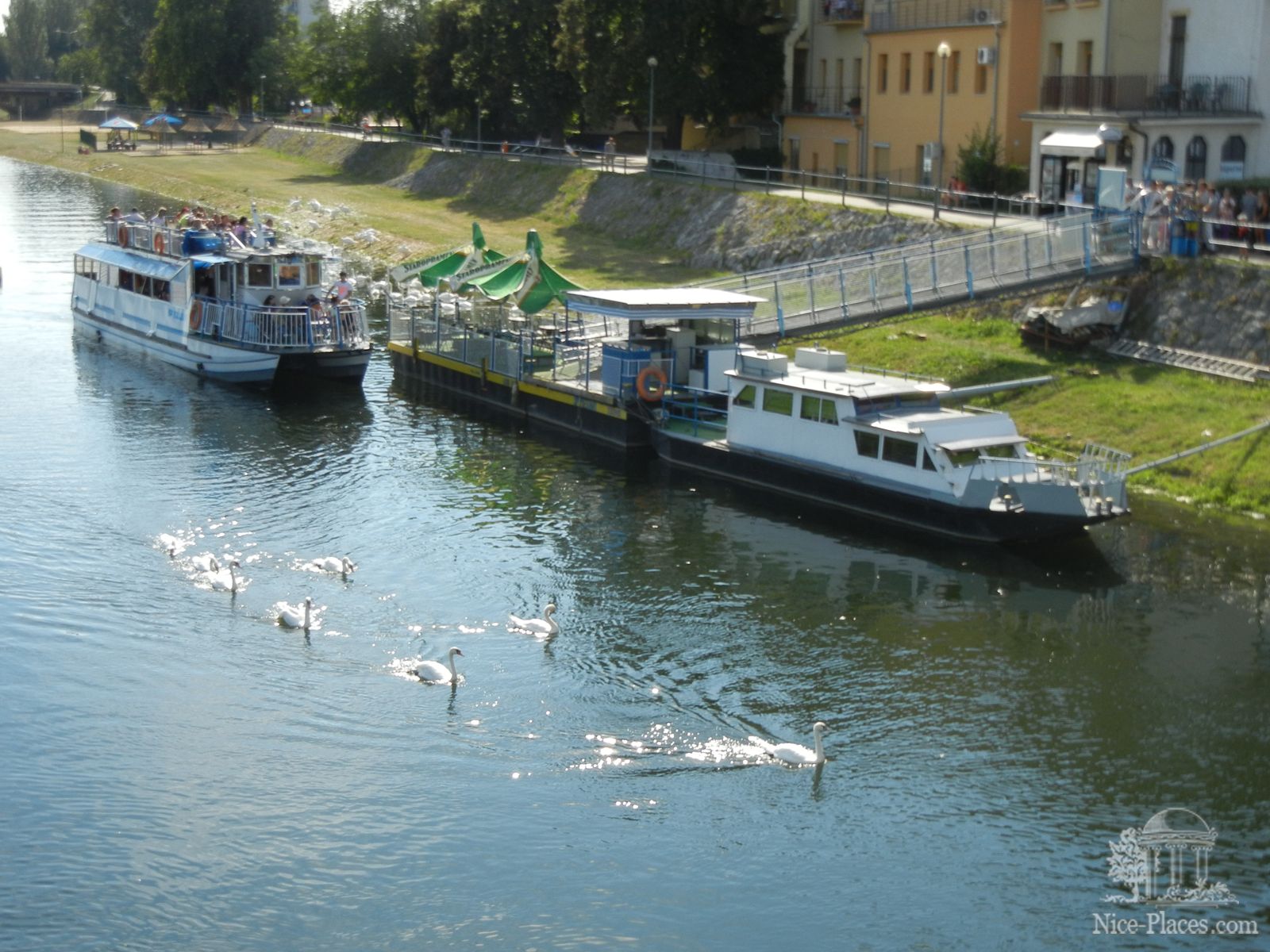 Отдохнув и подкрепившись в кафе, кстати очень вкусно и за вполне доступные цены, мы направились в сторону главной гордости Пештян - Спа-острову, он же Банный или Курортный остров. На остров ведет пешеходный Коллонадовый мост, поставленный в 1931-1933 годах по проекту архитеткора Э. Белуша. Слева от моста находится скульптура символа города — мужчина, ломающий костыль, а справа на набережной реки расположен причал, с него начинаются водные прогулки на кораблике. Желающих было очень много, а времени ждать совсем не было. Решили оставить прогулку на следующий раз. Тем не менее еще не зайдя на остров мы получили очередную дозу впечатлений — недалеко от причала, прямо на берегу мирно паслась целая стая белых лебедей. Признаться, такое количество сразу этих благородных птиц я видела впервые в жизни. Часть птиц плавала на воде, а тех что на берегу насчитала 45 штук. Лебеди подпускают к себе довольно близко, что позволило вдоволь их нафотографировать.