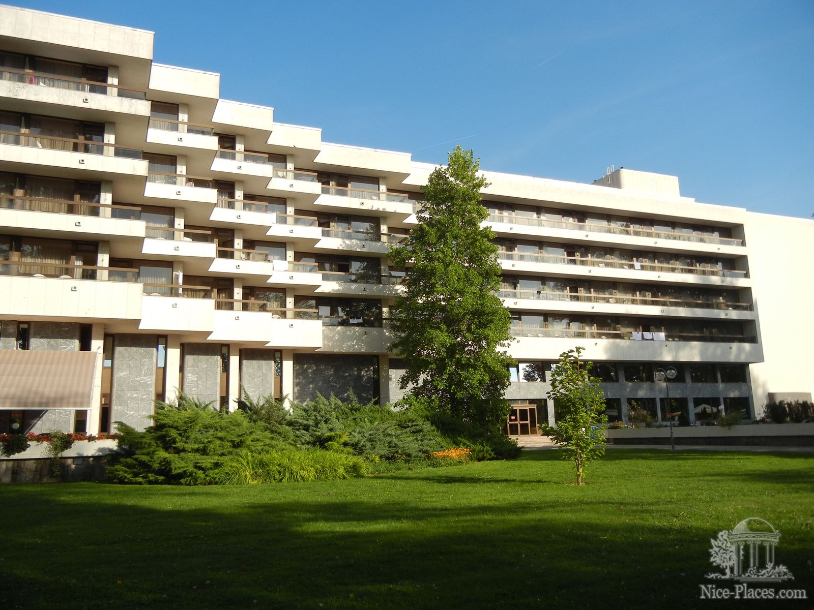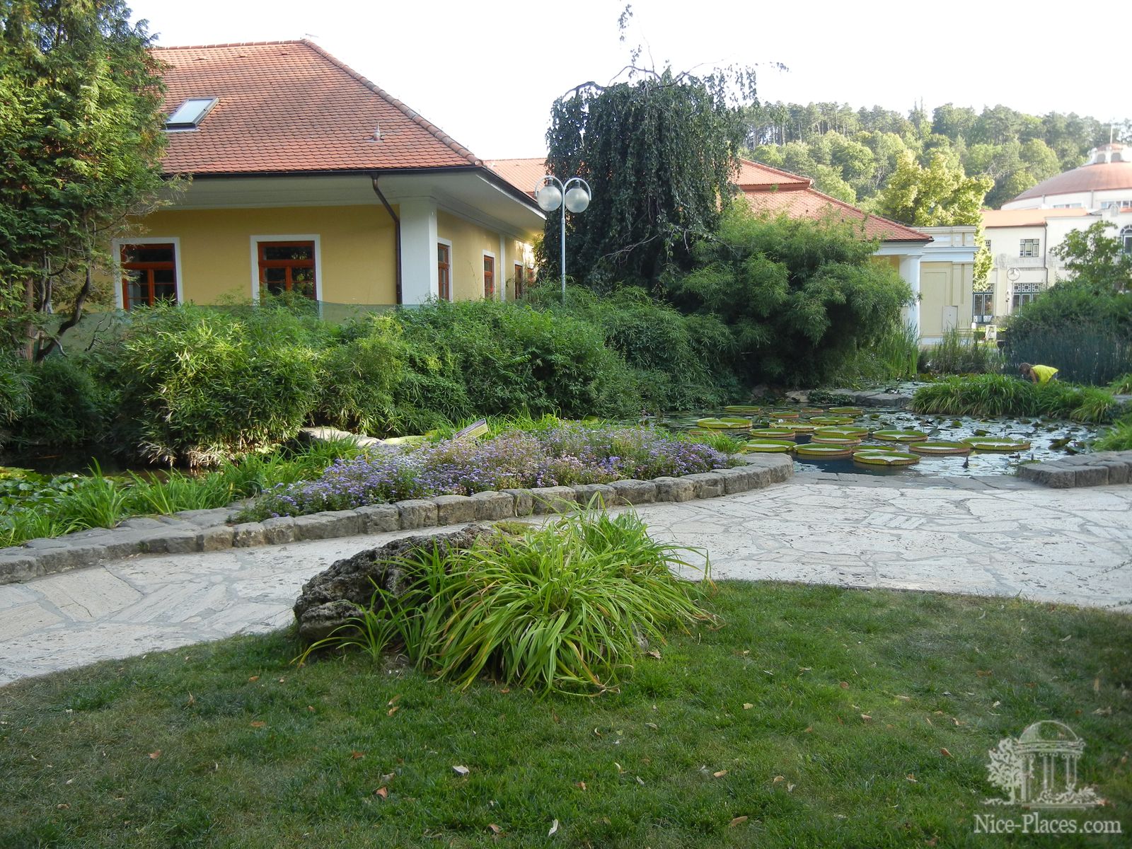 Перейдя через Коллонадовый мост мы оказались на Курортном острове — настоящем оазисе, наполненным красотой и умиротворением. Первое, что заслужило наше внимание — комплекс зданий под общим названием "Термальные дворцы", куда в том числе входит СПА-салон "Ирма". Здесь располагаются различные учреждения, предоставляющие проживание, лечение и всевозможные водо-грязе процедуры. На территорию сада Термальных дворцов нас пустили без проблем и мы походили по красивому садику с фонтаном позади здания.