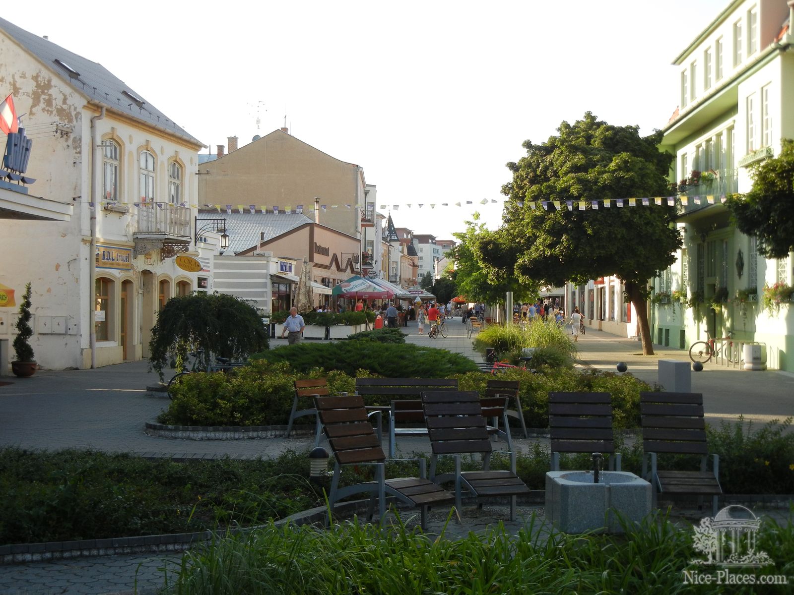 Далее нашему взору открывается удивительно красивая улица, это Парк Пассаж, одна из главных улиц Пьештян. Здесь мы делаем вторую остановку и садимся за столиком в уютном кафе напротив танцующего фонтана, бьющего прямо из выложенных на тротуаре камней, по которому бегает и визжит от вострога детвора. Кругом царит атмосфера праздого отдыха, даже громкая музыка тут не звучит, все равно ее заглушает шум фонтана, занимающего чуть ли не треть улицы.