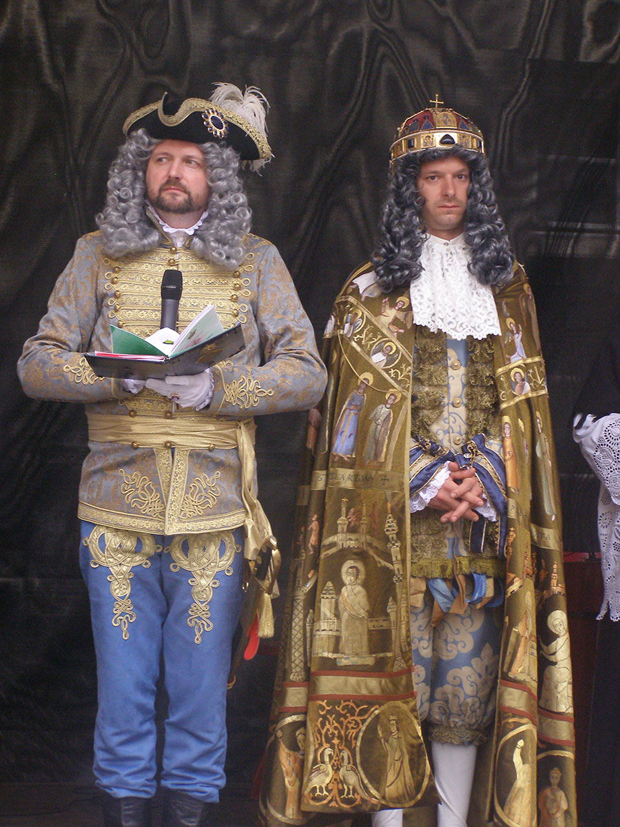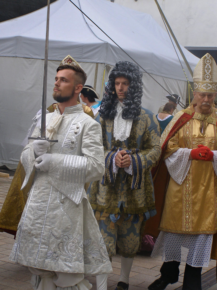 Празднества еще ни разу не повторялись. Каждый год туристов ожидает новая церемония, а значит, и новые впечатления. Ренессансную эпоху сменили времена барокко – и нынешняя коронация тому подтверждение. Мирослав говорит о том, что все костюмы абсолютно новые, шьются на заказ за границей, например, в Польше. Многие участники шествия прибывают уже со своими костюмами. Дамы в пышных платьях, кавалеры в расшитых золотом камзолах с кружевными манжетами, военные барабанщики, мушкетеры, послы иностранных государств – кого только нет на коронации. Многие участники следуют за королем на лошадях, которых привезли с конезавода под Брно. Императора Карла VI, которого здесь короновали в 1712 году как венгерского короля Карла III, изображает 28-летний актер Словацкого народного театра Лукаш Доза. Остальные герои коронации тоже молодые актеры из разных братиславских театров. Они с удовольствием позируют туристам, вступают с ними в шуточные диалоги.