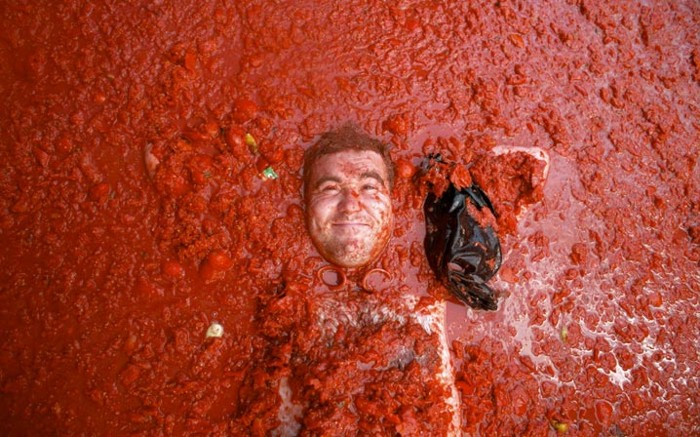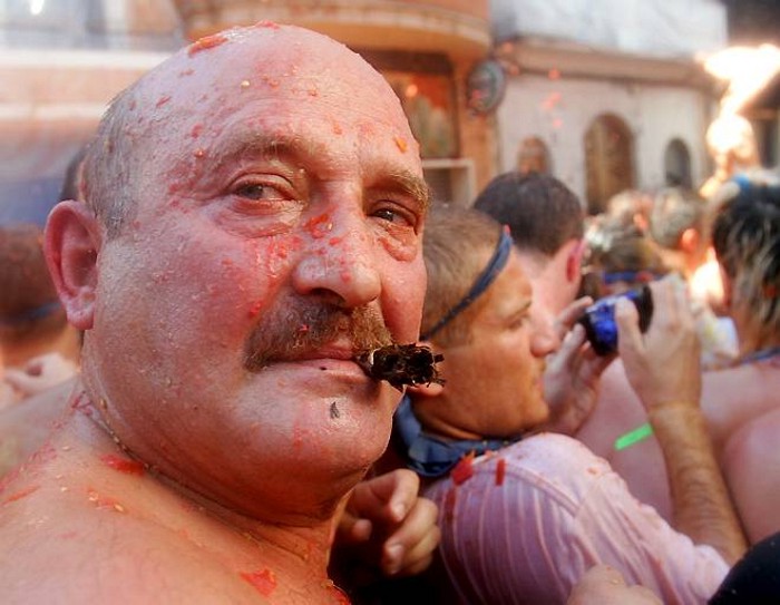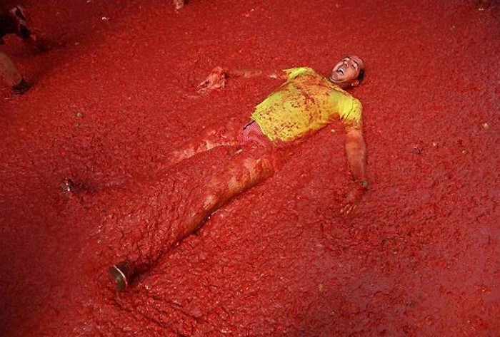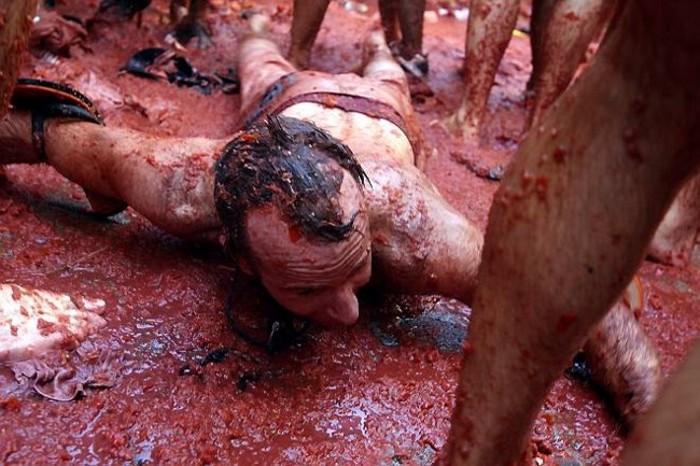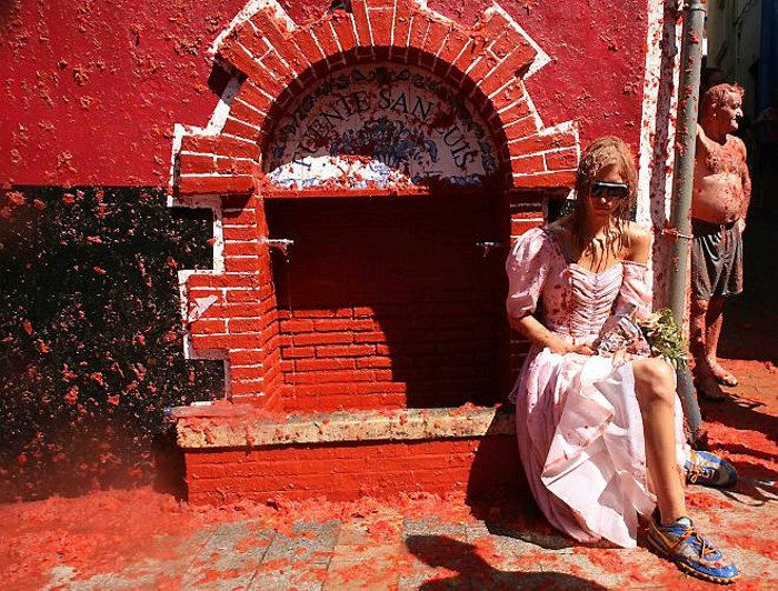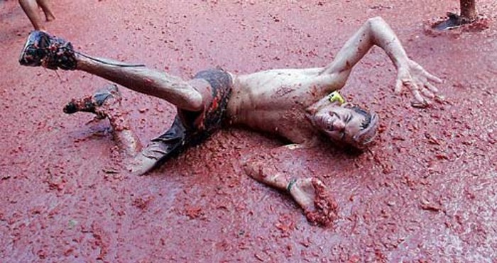 Как правило, в испанских городах общественные уборные отсутствуют, а практически все рестораны и бары Буньола во время проведения Томатины закрыты, в санитарных целях, так сказать. Праздник продолжается 12 часов к ряду, и участники, ясное дело, пьют немалое количество различного рода жидкостей. И рано или поздно, естественная нужда застанет вас врасплох. А туалет вы не найдете. В общем, не надо быть гением, чтобы понять, что красноватая жижа, заполняющая улицы города в своем составе имеет не один только томатный сок.