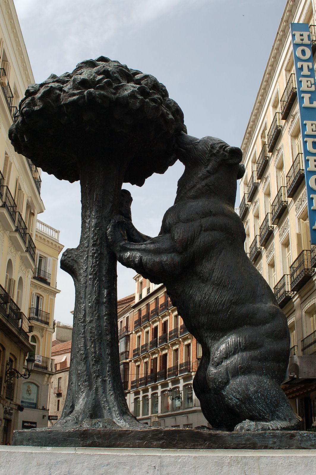 На площади Пуерта дель Соль помимо старинной ратуши с часами и памятником всадника на постаменте, находится памятник-символ Мадрида – медведь и земляничное дерево, которые также можно увидеть и на гербе города. Происхождение этих символов Мадрида до сих пор остается загадкой. Однако, гид обязательно расскажет вам основные версии появления мишки, опирающегося на ствол дерева. Первая – довольно интересная, но маловероятная гласит о том, что в незапамятные времена на метсе, где ныне находится Мадрид, была роща земляничных деревьев, в которой обитало множество медведей.