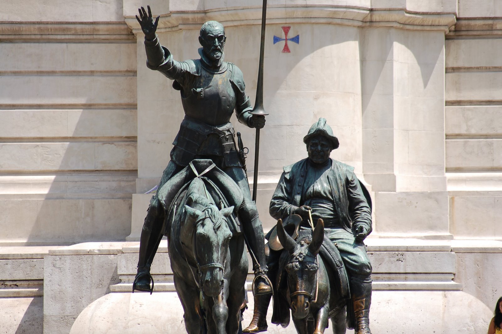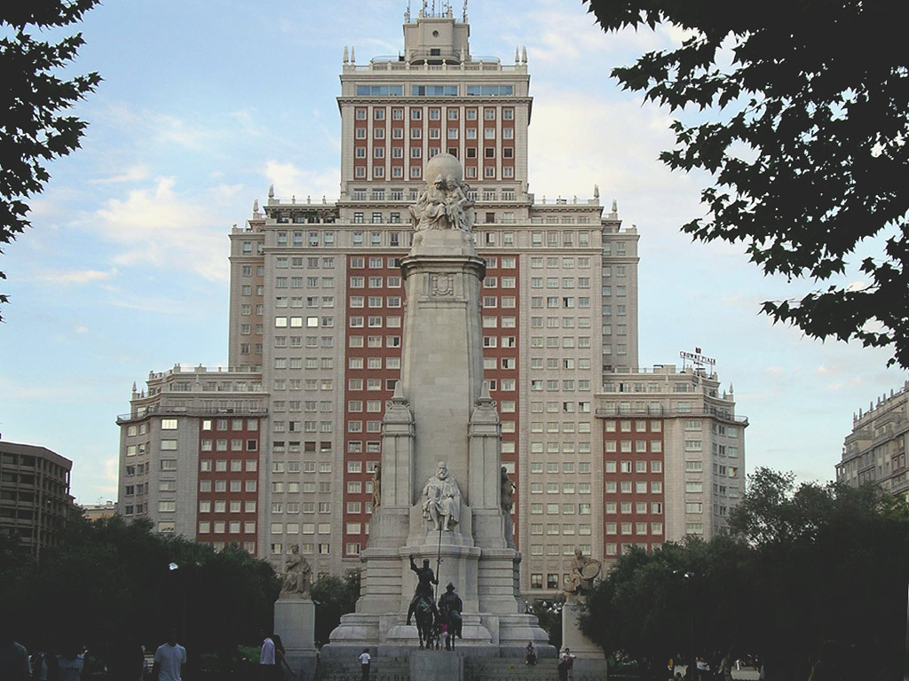 От королевского дворца по пешеходному маршруту можно добраться на одну из самых известных площадей Мадрида – площадь Испания. Сердцем площади является огромный постамент, посвященный всемирно известному испанскому писателю Мигелю Сервантесу, возле которого установлен памятник бессмертным героям его самого известного произведения "Дон Кихот". На площади разбит небольшой парк и установлены два фонтана, которые несут прохладу в летние дни. В ансамбль площади Испания входят два высотных здания, выстроенные по проекту братьев Отаменди в 50-е годы XX века. В свое время это были самые высокие здания в Мадриде.