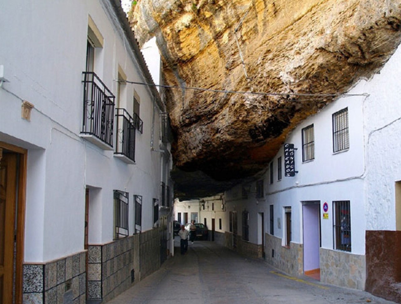 Похоже, что огромная скала вот-вот рухнет и навсегда похоронит под собой маленькие белые домики небольшой деревушки Setenil de las Bodegas, которые как бы прилипли к скале. Река Guadalporcún за тысячелетия существования сформировала внушительный каньон, пройдя через скалы, а жители деревеньки всегда стремились использовать любое возможное пространство для строительства своего жилья. В результате появилась терраса, на которой расположилась группа необычайных белых домиков.