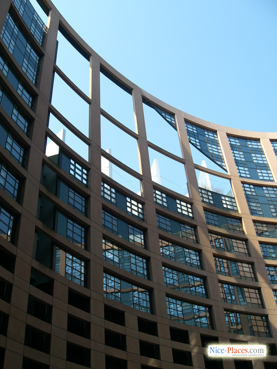 Величественный изогнутый фасад поражает воображение, своими очертаниями он повторяет изгиб берега реки Иль и искусственного Марнско-Рейнского канала. Зеркальная сверкающая башня красиво отражается в водах реки, а в ее элементах можно рассмотреть отражение величественного Страсбургского кафедрального собора. Несмотря на современный архитектурный стиль, здание Европарламента не является образцом монументализма, его элементы сочетают формы кеплеровского эллипса и галилеевского круга. Архитектурный ансамбль, занимающий площадь в двести тысяч квадратных метров, включает шесть отдельных строений. К ним примыкает живописное водное пространство канала и реки, их ухоженные набережные, пешеходные галереи и зеленые насаждения.