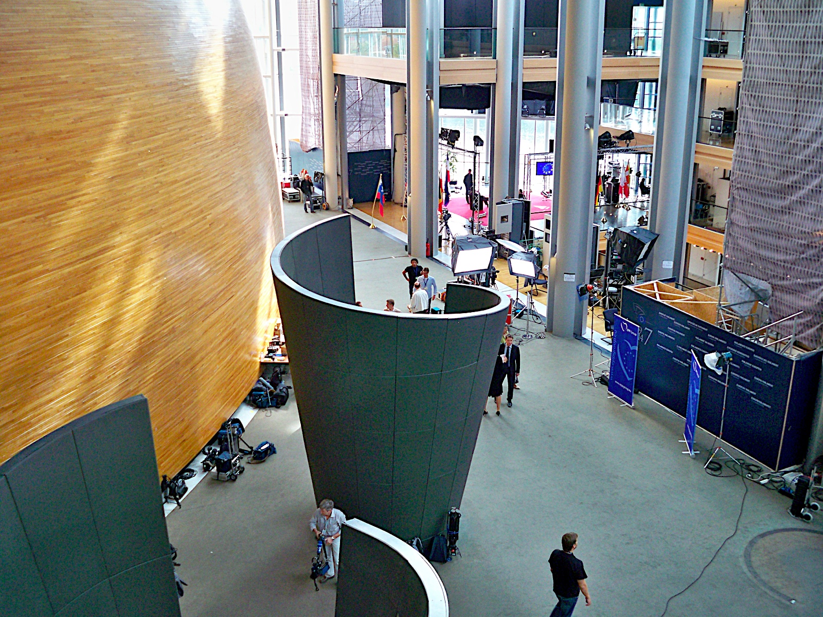 В центре комплекса Европарламента находится просторный зал для заседаний, рассчитанный на 750 мест, где проходят голосования депутатов, принимаются важнейшие для Европы решения, проводятся официальные прения. Даже прогуливаясь по набережной реки Иль, можно без труда различить место, где расположен зал для заседаний – над ним возвышается величественный купол, выполненный из массива дуба. Площадь самого купола более восьми тысяч квадратных метров. Зал, напоминающий греческий Амфитеатр, гармонично сочетается с общей дугообразной формой административного здания, где расположены и другие просторные залы для заседаний и официальных переговоров.