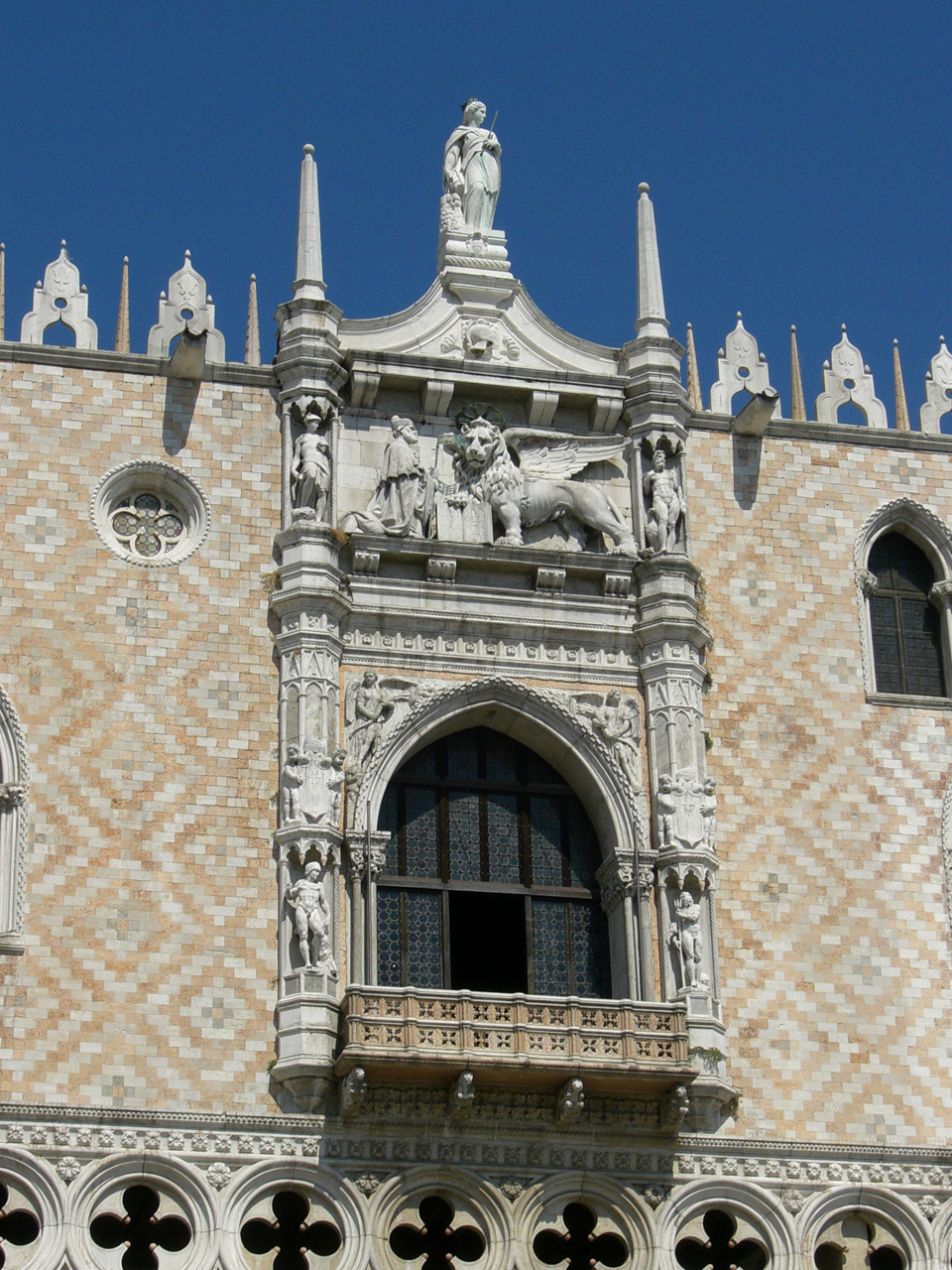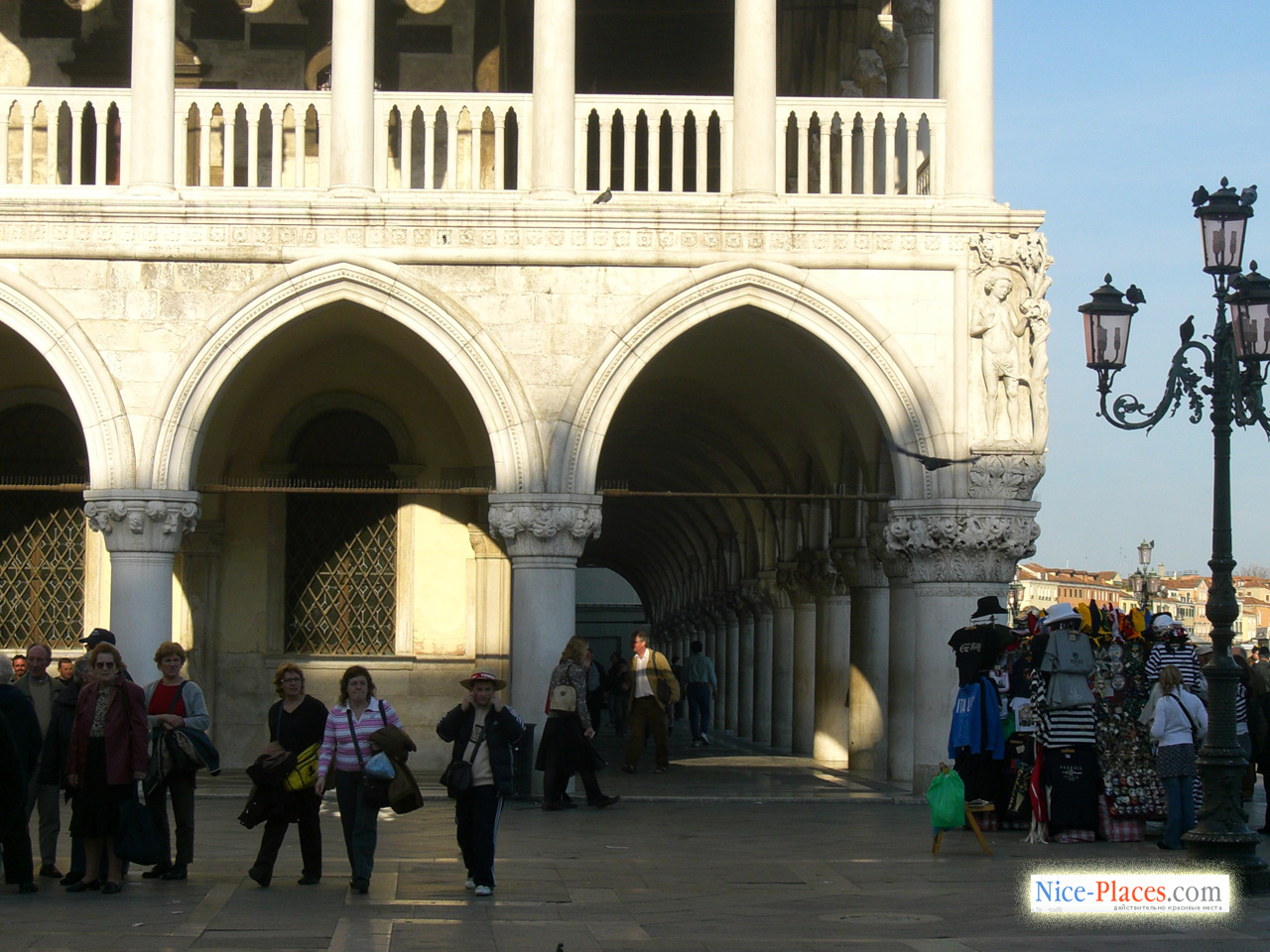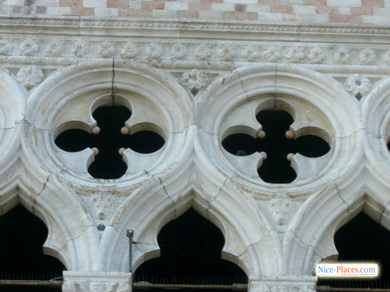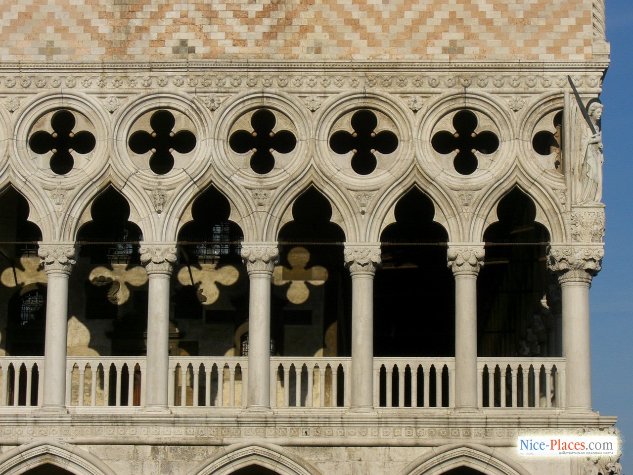 Галерея, расположенная на втором этаже, представляет собой воздушный балкон, который затеняет с южной и западной стороны внутренние помещения и служит удобным переходом между ними. Ажурные галереи и гладкая стена, так удачно скомбинированные в фасаде Дворца дожей, придают облику здания богатый композиционный контраст и будто бы открывают его скрытую всеобъемлющую энергетику, которая вырывается, обретая покой на просторах венецианской лагуны.