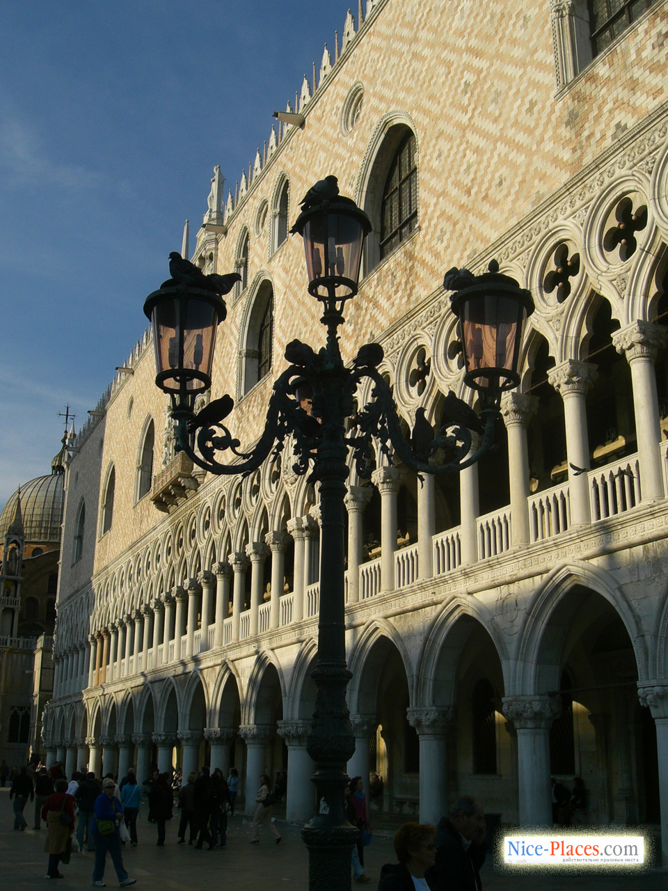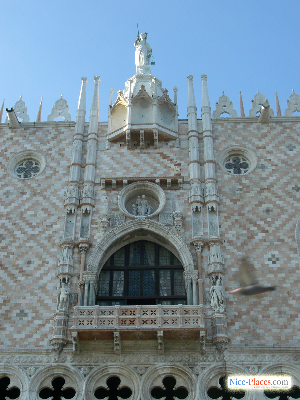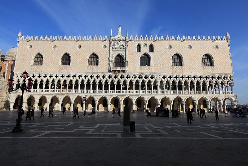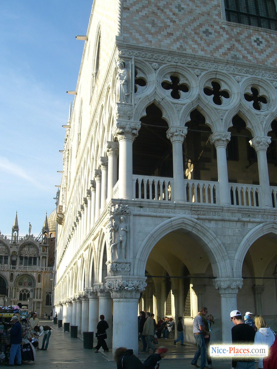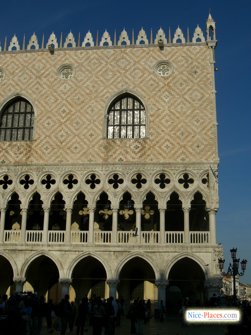 К XIV в. Дворец дожей представлял собой жалкую ветхую развалину и в 1309 г. было начато строительство нового здания, которое расширялось и достраивалось на протяжении следующих двух столетий. Над дворцом трудились самые талантливые архитекторы и зодчие. И их творение воистину вызывает неподдельное восхищение. С одной стороны здание выглядит массивным и монументальным, но в тоже время опорой для верхней его части служат легкие ажурные арки. На первый взгляд может показаться, что дворец просто-напросто опрокинули фундаментом вверх, и все из-за необычного устройства фасада: слабые опоры внизу и монолитная высокая стена сверху.