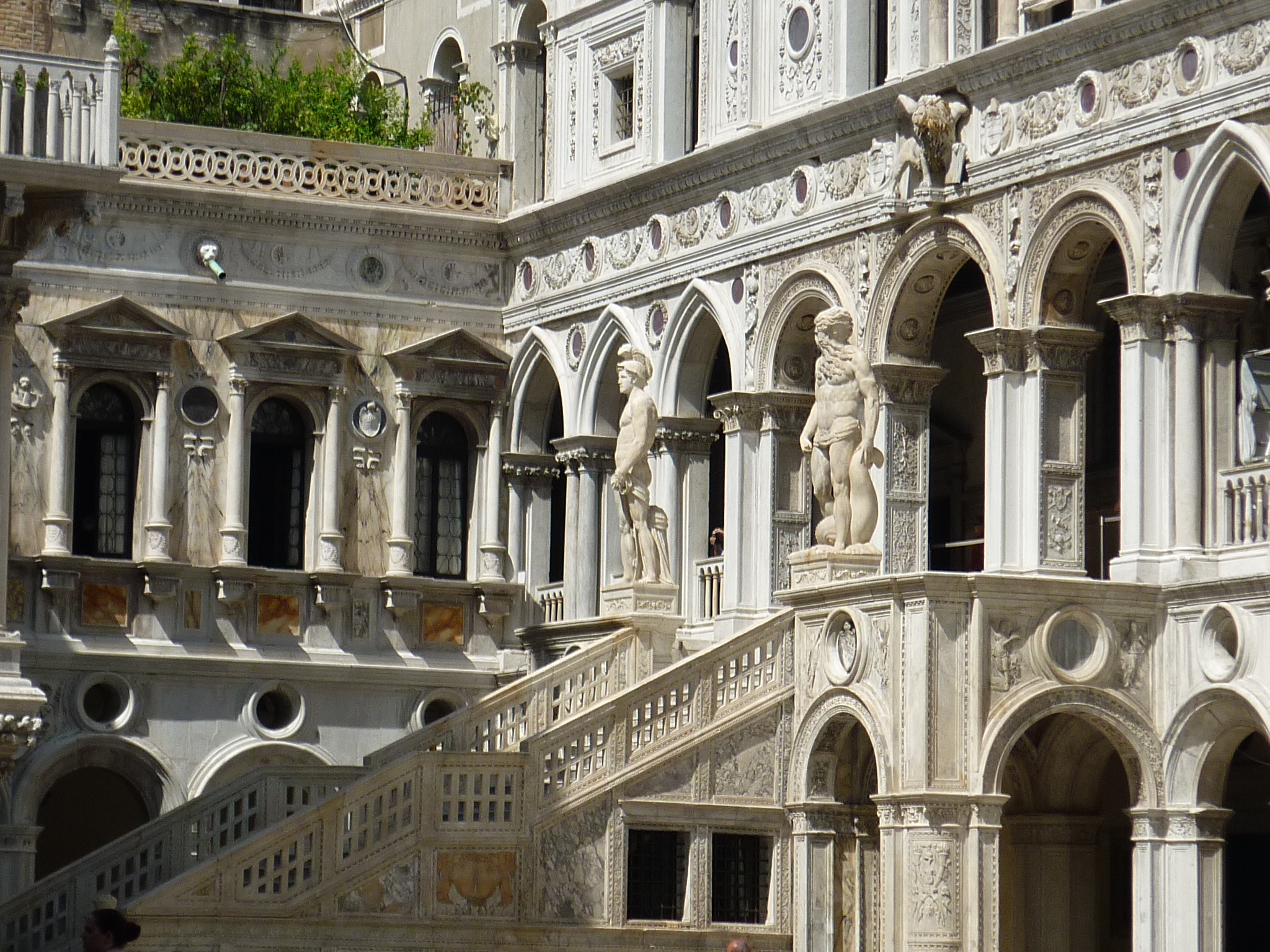 Пройдя "Porta dell Carta", вы попадете в пышный внутренний двор, который по периметру окружают двухъярусные мраморные аркады. Здесь установлено восемь скульптур, выполненных в древнегреческом стиле, выделить из которых следует статую генерала дела Ровере (скульптор Джованни Бандини). Середину двора украшают два роскошных колодца, сделанных из бронзы, которые некогда были источниками лучшей в Венеции воды. Каждый день тут толпились торговки водой, доставлявшие прохладную и вкусную влагу в самые дальние кварталы города.