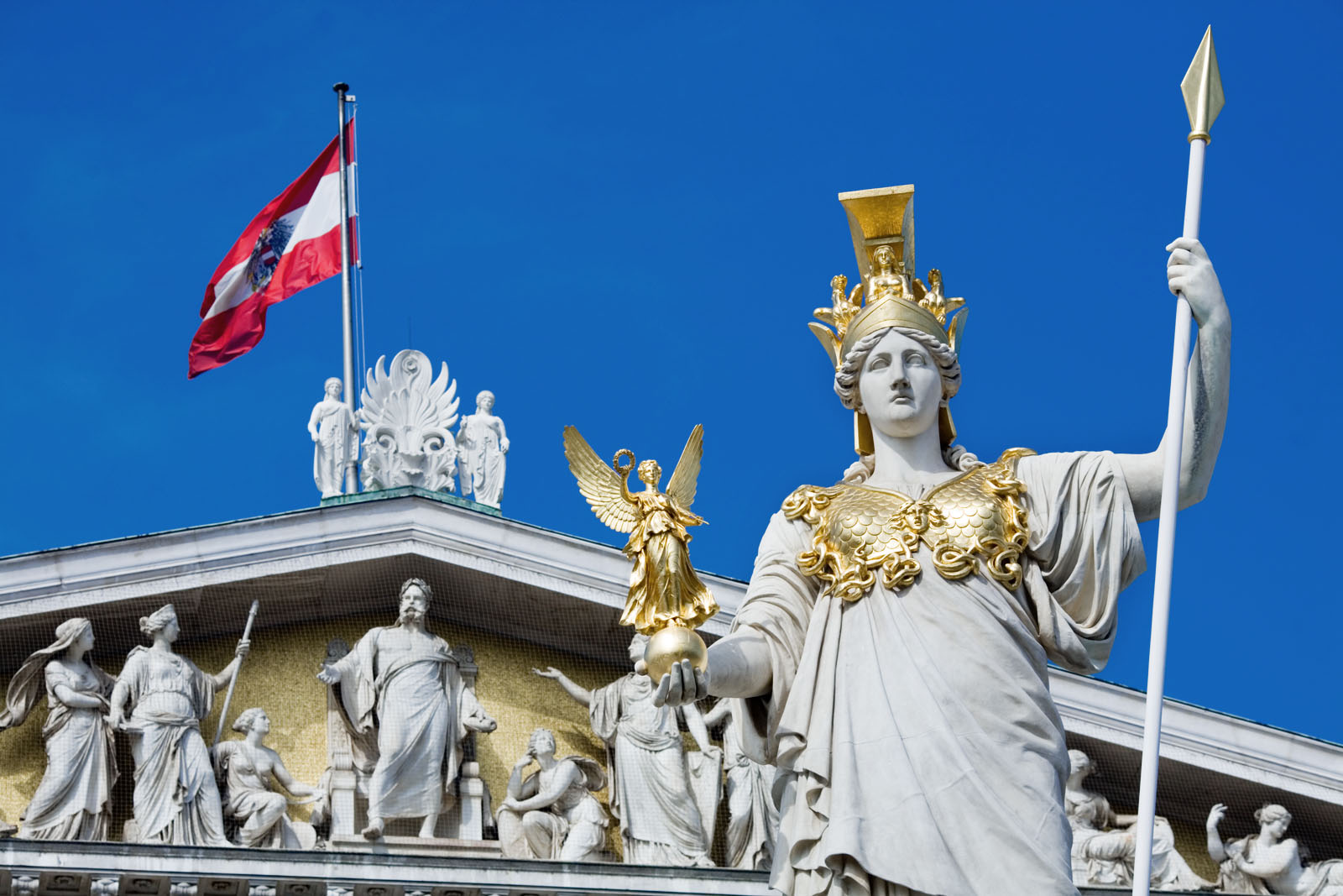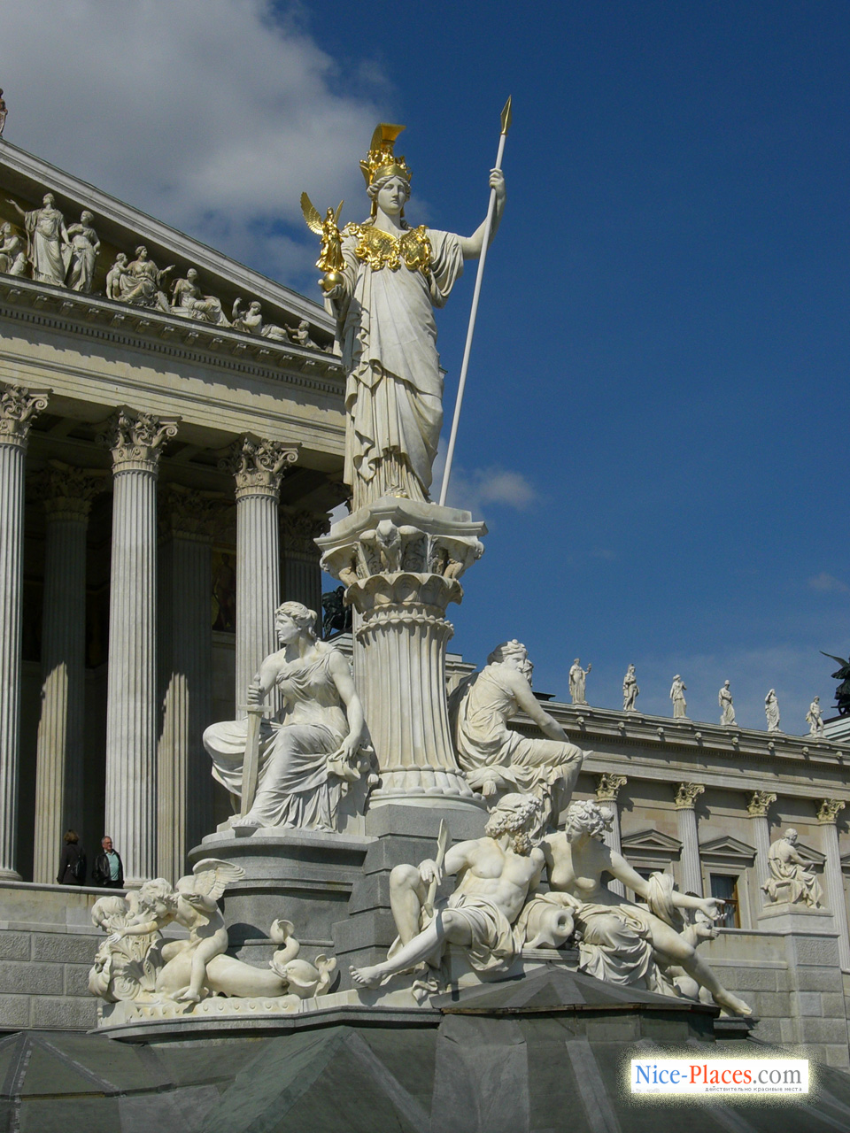 По идее создателя, величественные конные монументы словно призывают австрийских депутатов усмирять свои политические страсти во время обсуждения принимаемых законов. Планируется и реставрация скульптурных композиций историков, которые были установлены около парламента, словно в назидание депутатам – они должны знать историю своей страны и с пользой для нее извлекать уроки из прошлого. Для пониманий аллегорий, проявляющихся в интерьерах австрийского парламента, нужно хорошо знать греческую мифологию – скульптуры античных богов выстроились по бокам от входа во внутренний дворик. По левую от себя сторону посетители здания увидят Зевса-громовержца, богиню мудрости Афину, красавца Аполлона, могущественную Геру и трудолюбивого Гефеста. А по правой стороне стоят статуи воинственного Ареса, величественного Посейдона, Деметры, охотницы Артемиды. На арочными перекрытиями восседает статуя Австрийской Девы, мужчины-слуги, стоя на коленях, клянутся ей в верности, а служанки-женщины преподносят дивные дары.