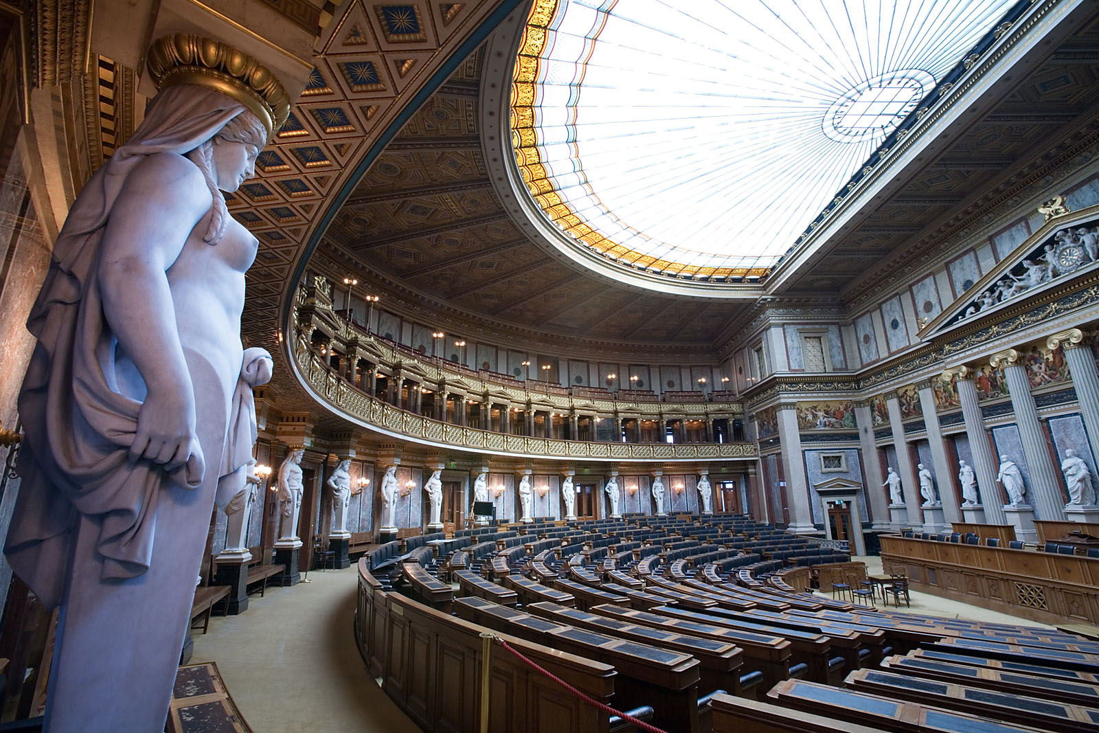 Посещение Венского парламента будет неполным без осмотра зала Национального совета, где заседает нижняя палата. Зал во время войны был полностью уничтожен, но его восстановление было проведено очень быстро. Интерьер зала заседаний выглядит совсем по-современному, декоративных элементов со времен имперской архитектуры здесь попросту нет. Изюминка помещения – отличная акустика, достигаемая за счет особого материала, использующегося при отделке стен. Интерьер оформлен в стиле минимализма, и единственным украшением зала является стальной герб Австрии.