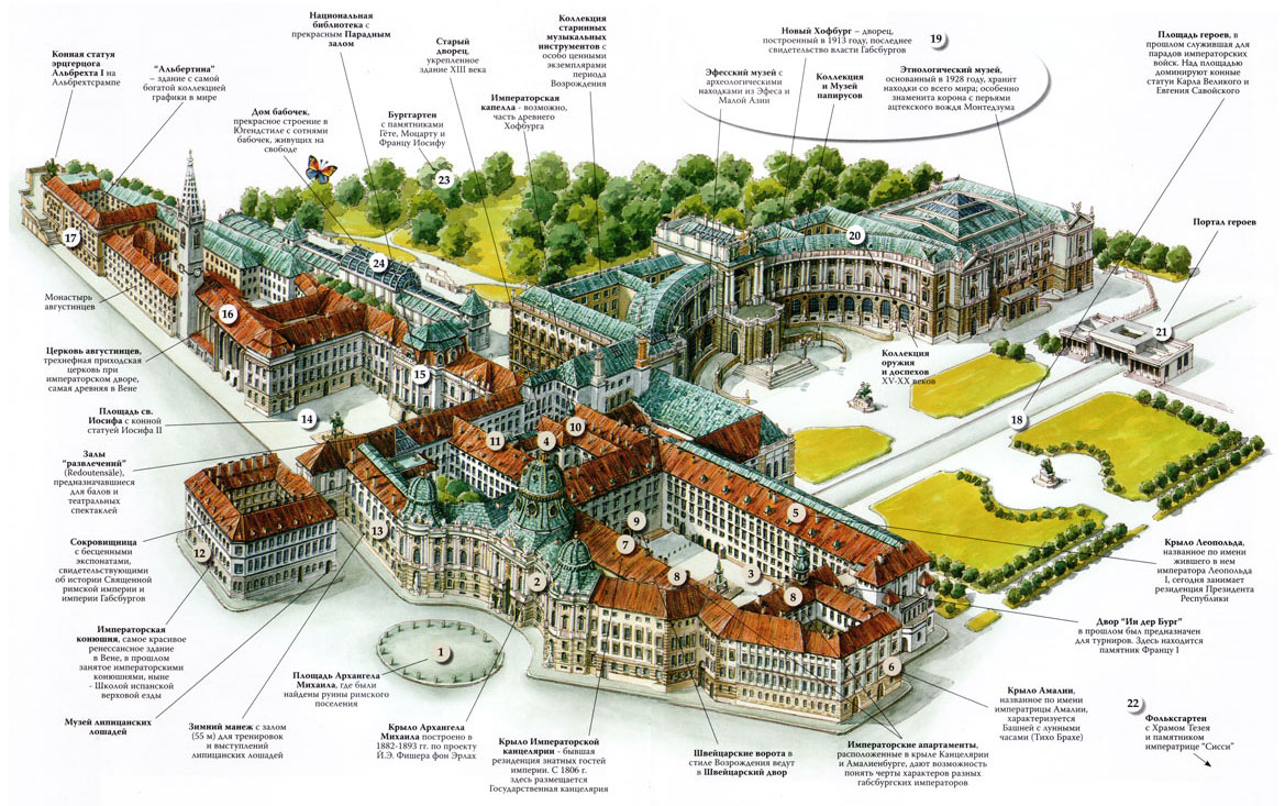 Каждый турист, приезжающий в Вену, начинает знакомство с городом с осмотра старинного замка Хофбурга, известного как «святая святых» Австро-Венгерской монархии. Архитектурный ансамбль замка довольно сложен, он включает несколько отдельно стоящих зданий, между которыми расположены просторные площади и дворы. Гуляя по территории замка, словно проходишь через различные исторические эпохи, узнавая о культуре и судьбах его владельцев.