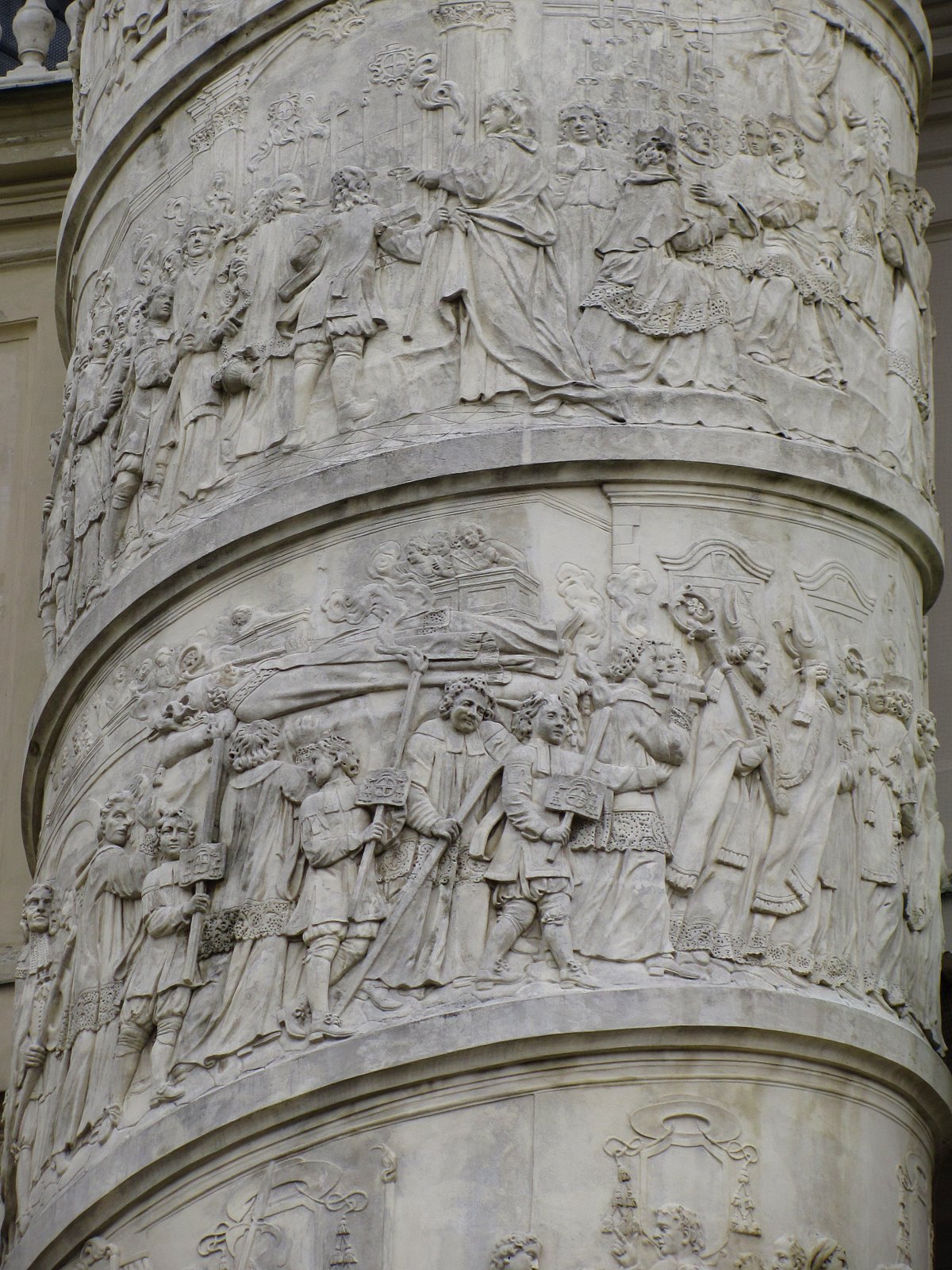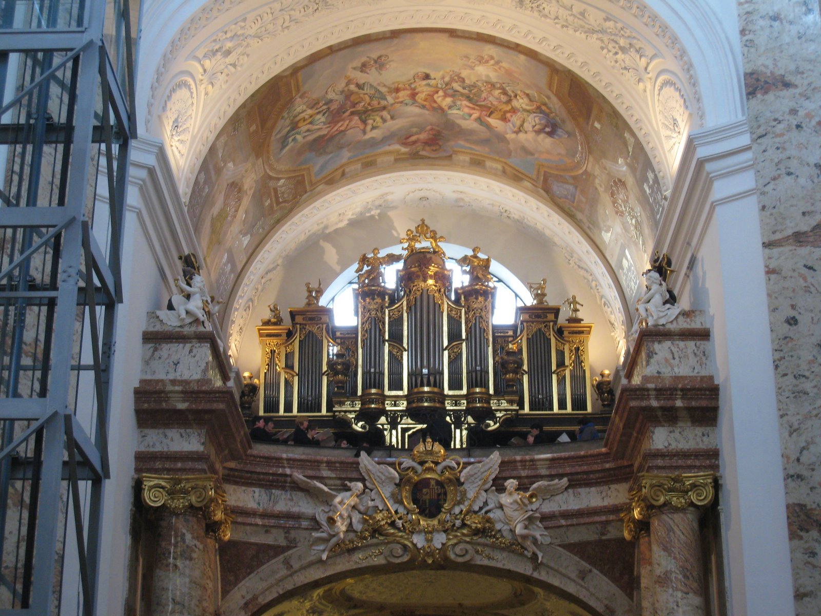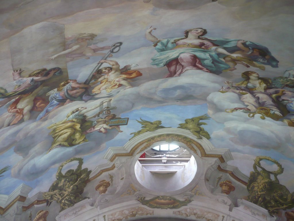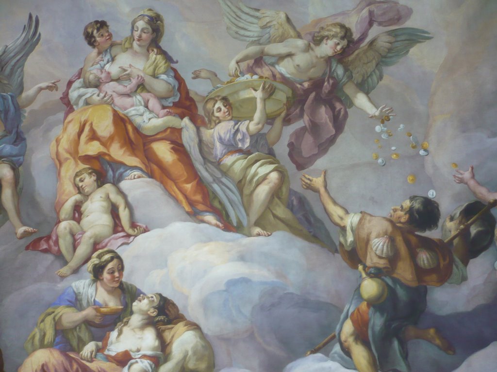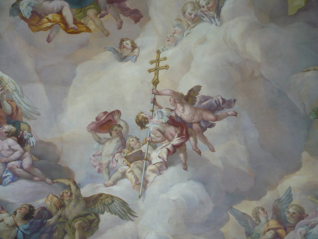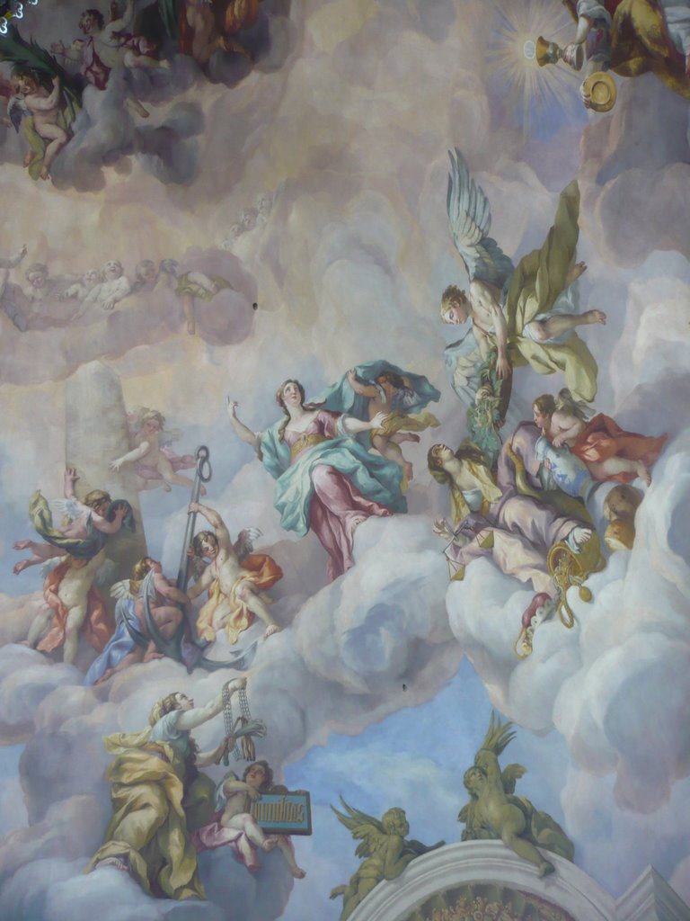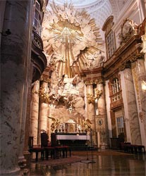 внимание на скульптурную группу перед входом и фигуры на фронтоне здания. Перед входом стоят ангелы, символизирующие Новый и Ветхий Завет, на фронтонах аллегорическое изображение добродетели: Покаяния и Милосердия, Смирения и Веры… Ну и какая же церковь без небесного покровителя. В центре восседает тот самый Святой Карл, который и должен был защищать Вену от чумы. Тема Карла Борромея просматривается также и на рельефах двух монументальных колонн, установленных по обеим сторонам от центрального входа. После такого внешнего великолепия начинаешь даже задумываться, стоит ли смотреть храм внутри – что еще мог «намешать» этот неординарный архитектор. На удивление, интерьер церкви достаточно «спокоен». Внимание привлекают потолочные фрески, в большинстве своем изображающие славную жизнь Карла Борромея.. Большинство фресок создал Иоганн Михаэль Роттмайр из Зальцбурга, хотя в росписи интерьеров участвовали и другие художники. Яркой
