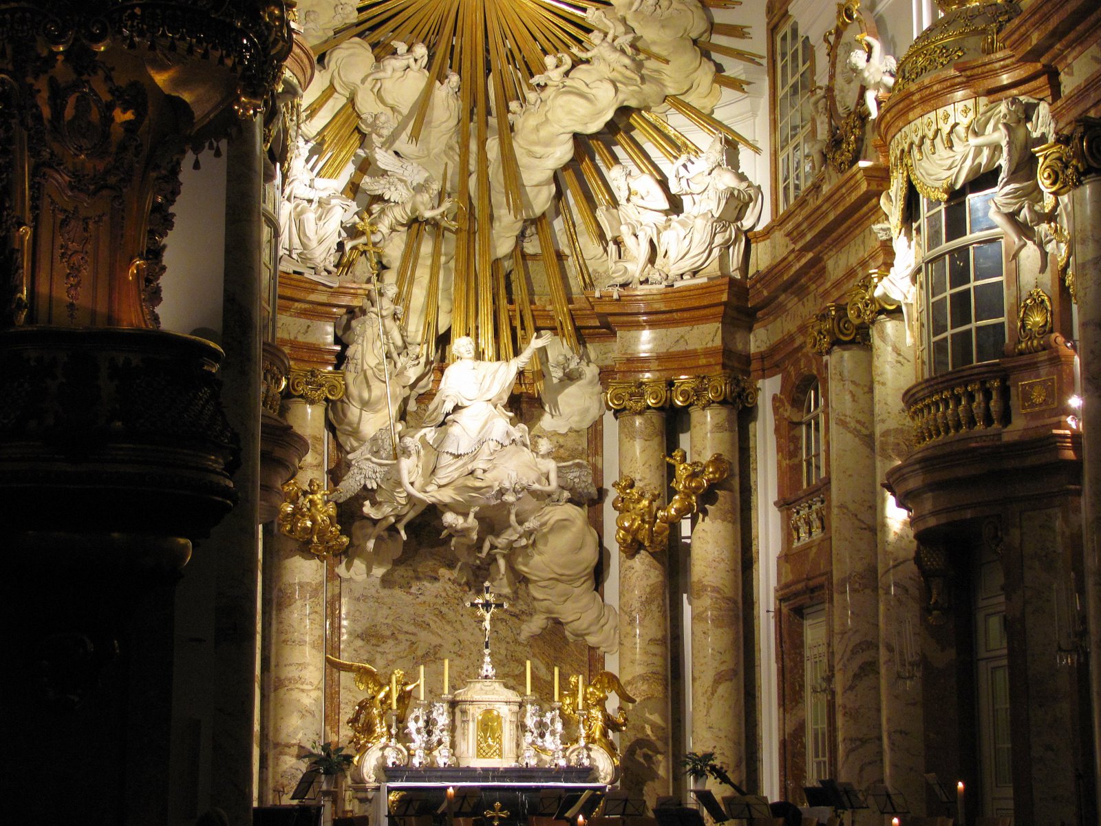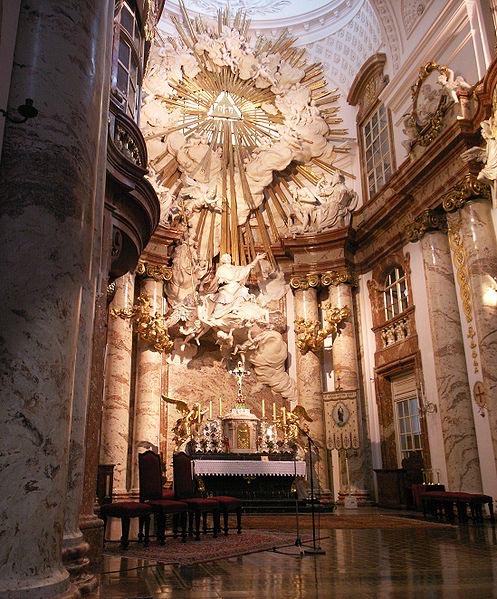 барочной пышности интерьера способствует также главный алтарь, спроектированный Иоганном Бернхардом Фишером фон Эрлахом, его украшает лепной рельеф, изображающий св. Карла Барромея, вознесенного в рай на облаке в окружении ангелов и херувимов.