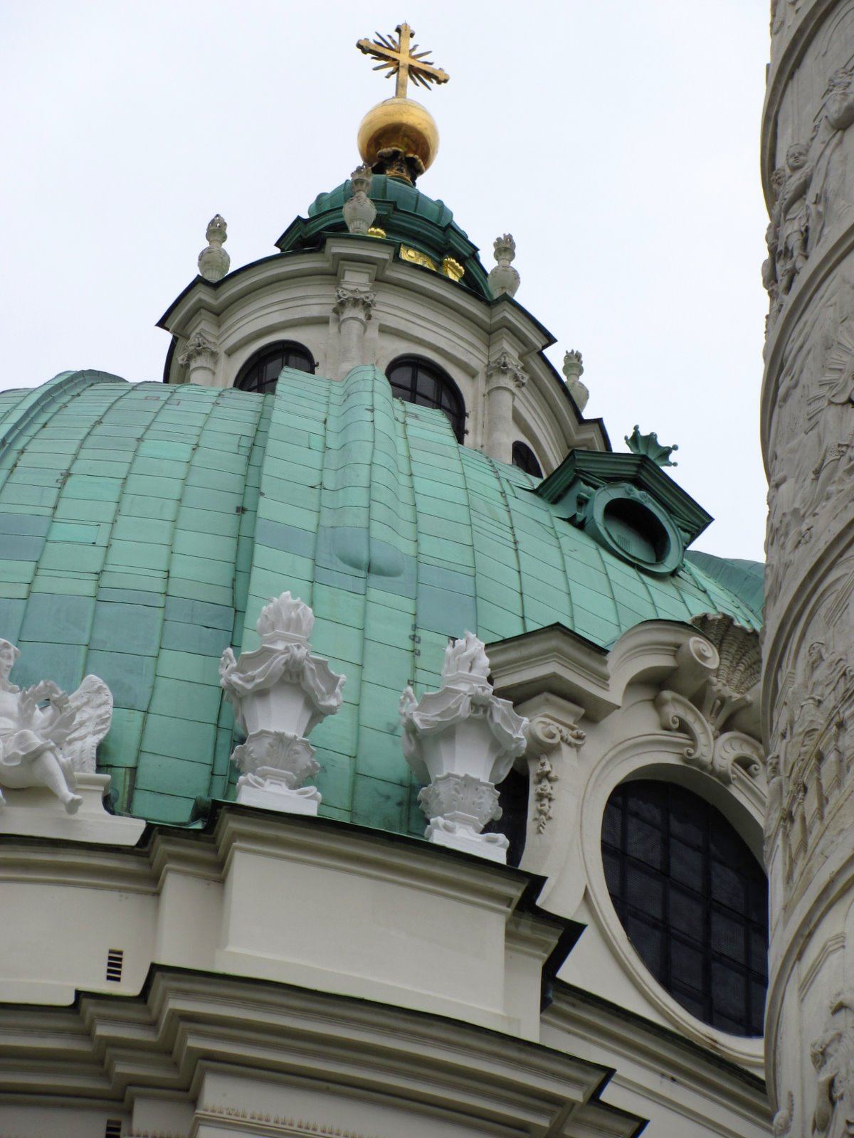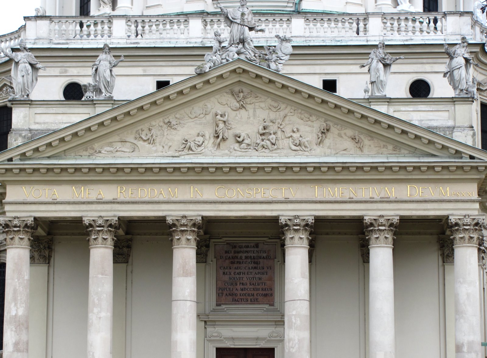 внимание на скульптурную группу перед входом и фигуры на фронтоне здания. Перед входом стоят ангелы, символизирующие Новый и Ветхий Завет, на фронтонах аллегорическое изображение добродетели: Покаяния и Милосердия, Смирения и Веры… Ну и какая же церковь без небесного покровителя. В центре восседает тот самый Святой Карл, который и должен был защищать Вену от чумы. Тема Карла Борромея просматривается также и на рельефах двух монументальных колонн, установленных по обеим сторонам от центрального входа.