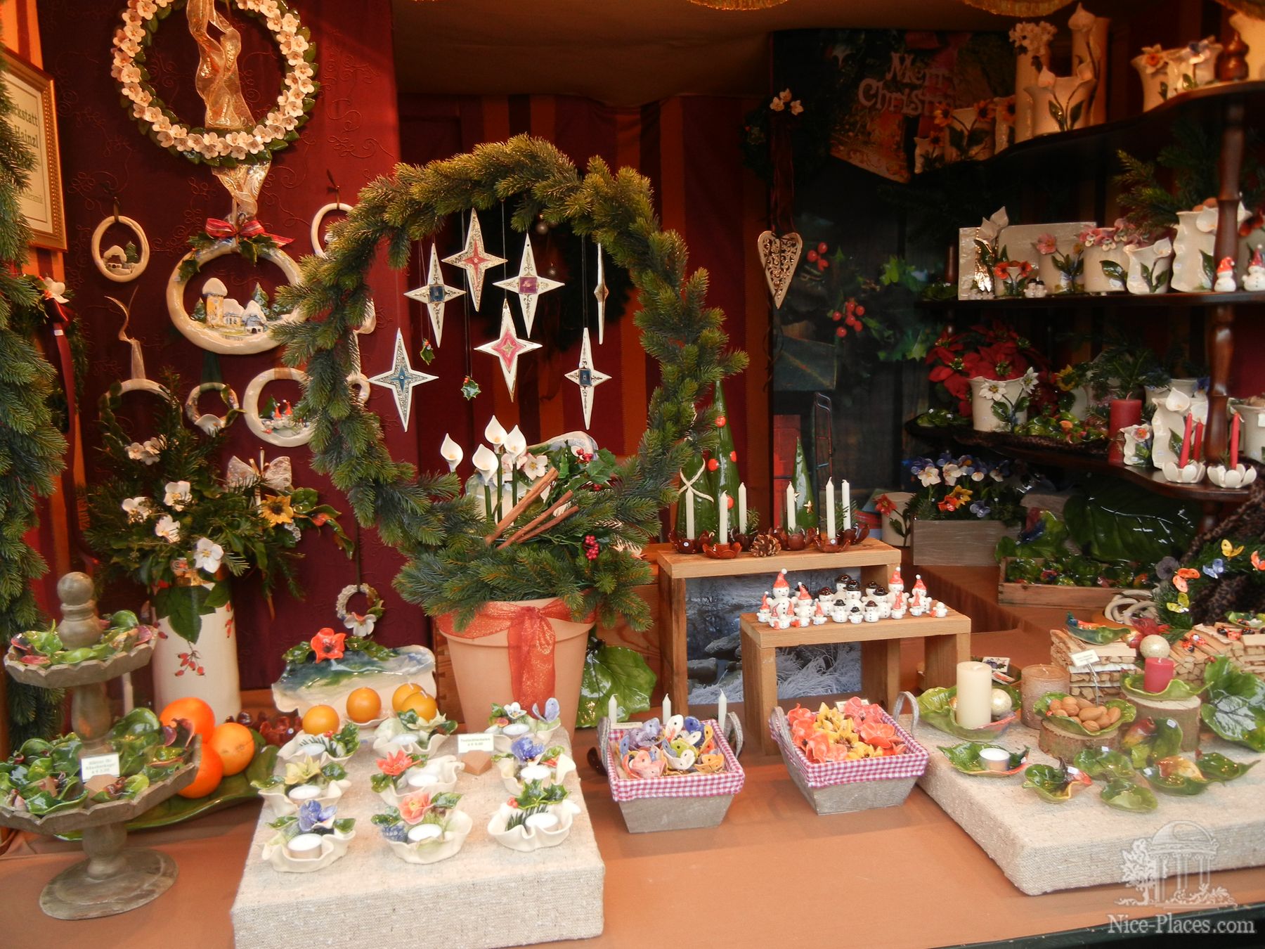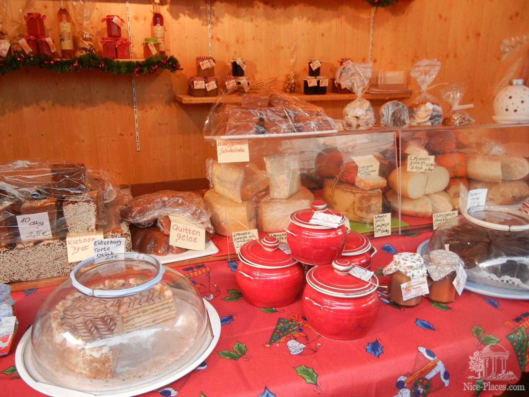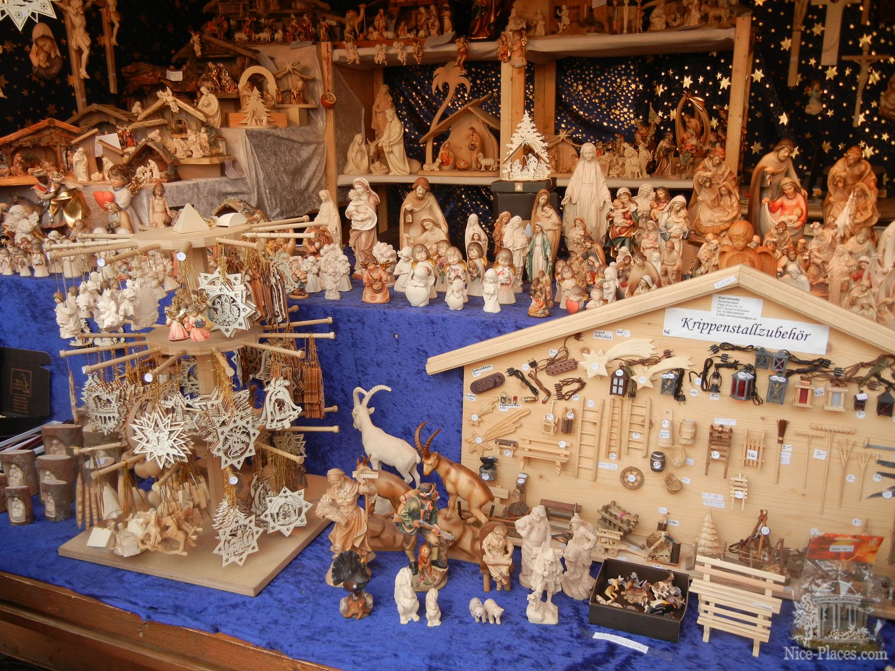 Очень понравилось оформление ярмарки, например, большой деревянный стол с лавочками, покрытыми овечьими шкурами, куда можно сесть с купленной едой и напитками. В центре площади был установлен большой адвентный венок с четырьмя свечами. По традиции, каждую субботу в период адвента зажигается одна из свечей. Множество таких венков поменьше размером и в разном исполнении продавались в павильонах. На этой ярмарке поразило обилие маленьких комнатных вертепов ручной работы очень качественного исполнения и антикварные старинные изделия. Чего только здесь не было: старинные утюги на углях, карманные часы, странной формы ложечки и вилки, щипцы для сахара и многое дургое.