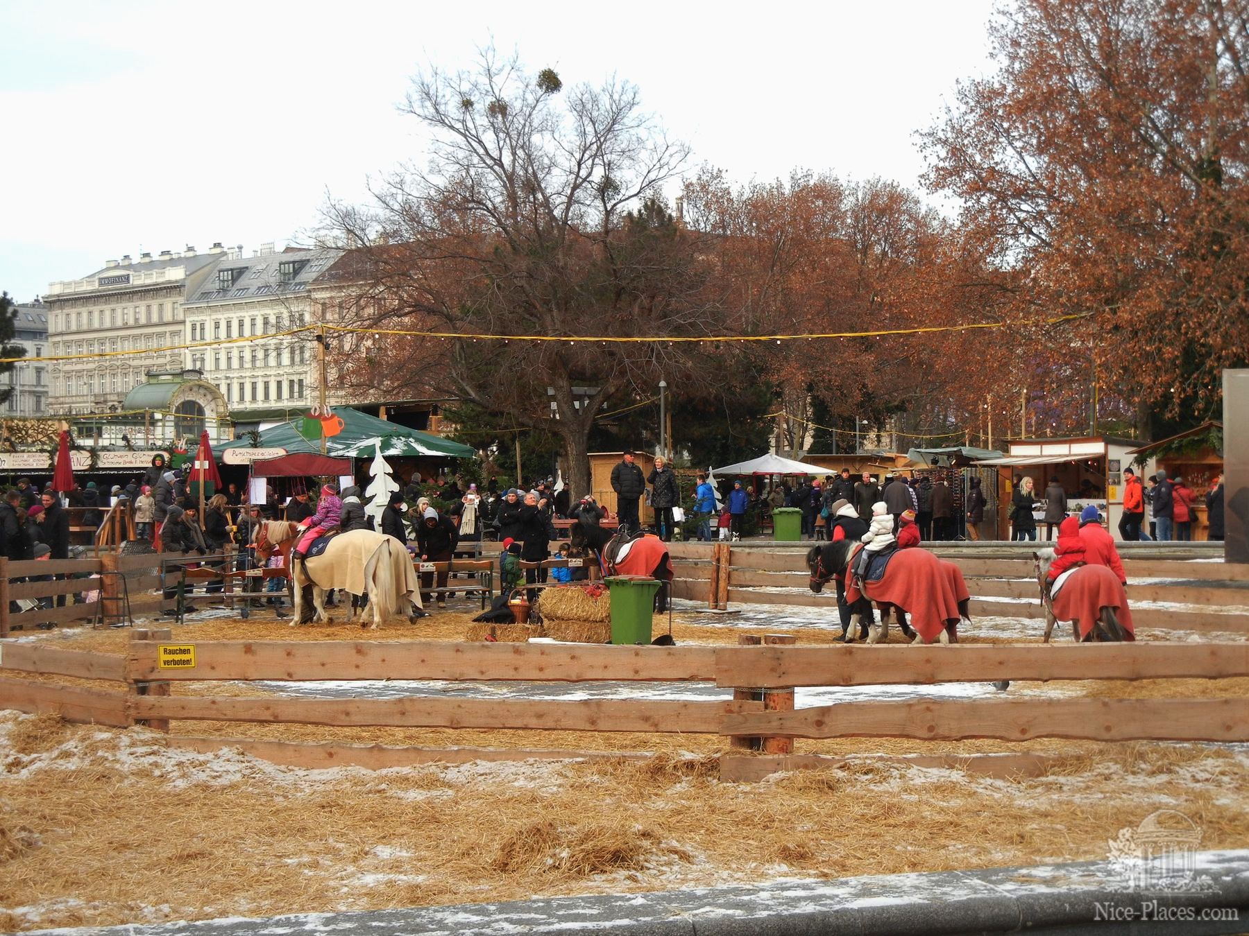 На площади перед церковью Карлкирхе развернулась настоящая сельская деревушка с обилием сена, снопы которого встречались буквально повсюду. Здесь особенно понравится детям, ведь на месте большого фонтана сделали детскую площадку, засыпанную сеном. Там же овечки жуют это самое сено, а детей по кругу катают на лошадях и пони. Несколько кругов на лошадкестоит 3 Евро, вполне нормальная цена для Вены.