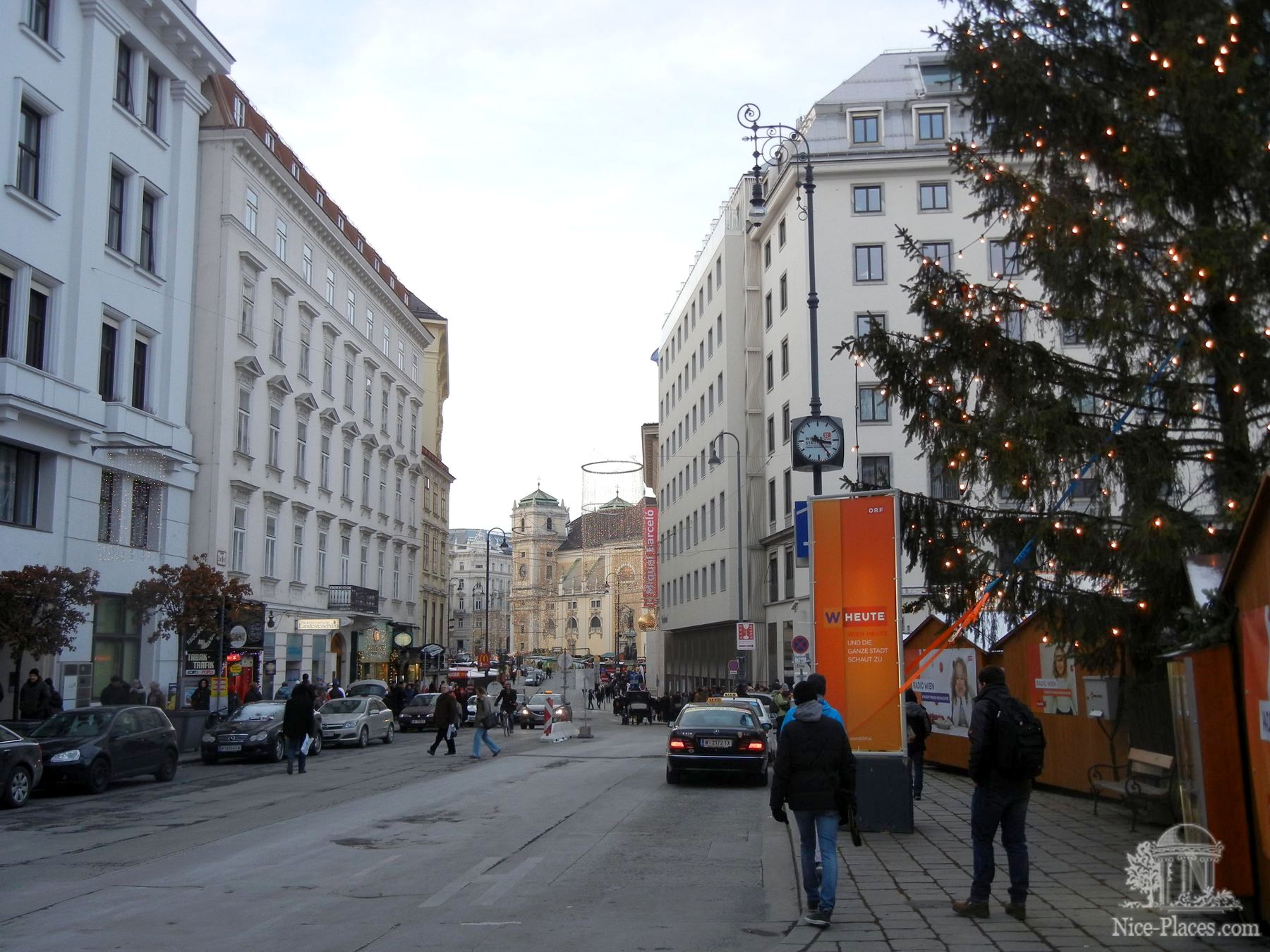 Улица Mariahilfer Strasse. Эта одна из основных шоппинг-улиц Вены. По обе стороны улицы кроме павильонов с едой и рождественскими горячими напитками расположено множество торговых центров, магазинов брендовой одежды, супермаркетов, кафе и баров, куда можно зайти погреться и посидеть от долгой ходьбы, а если повезет, попасть на рождественские скидки и распродажи.