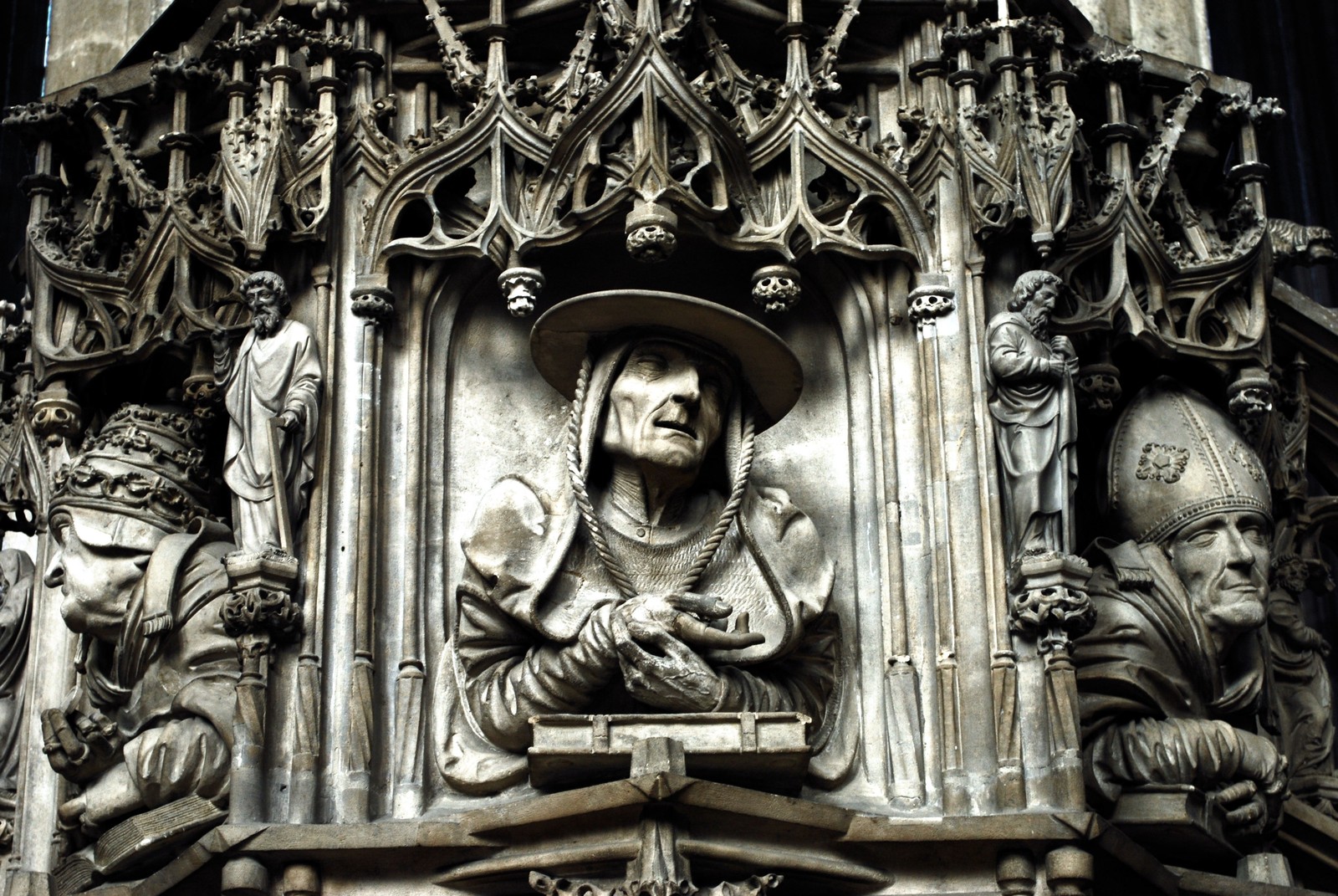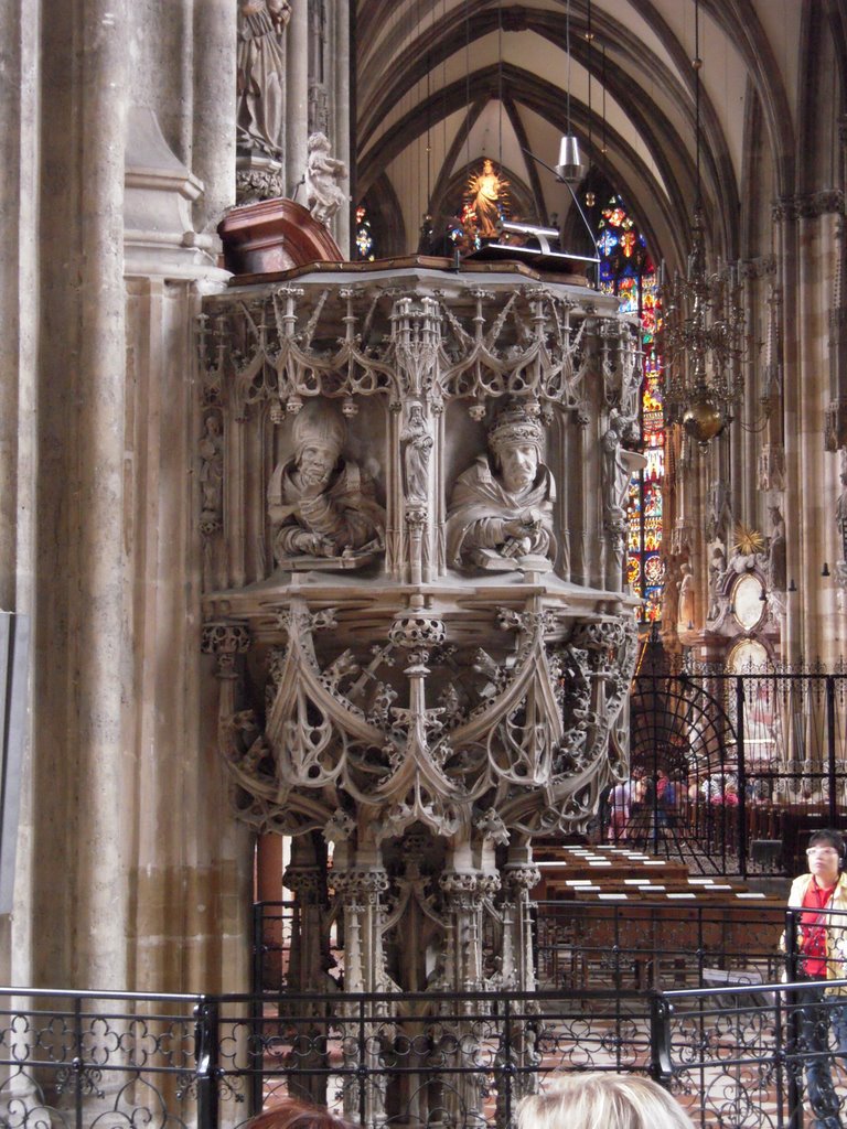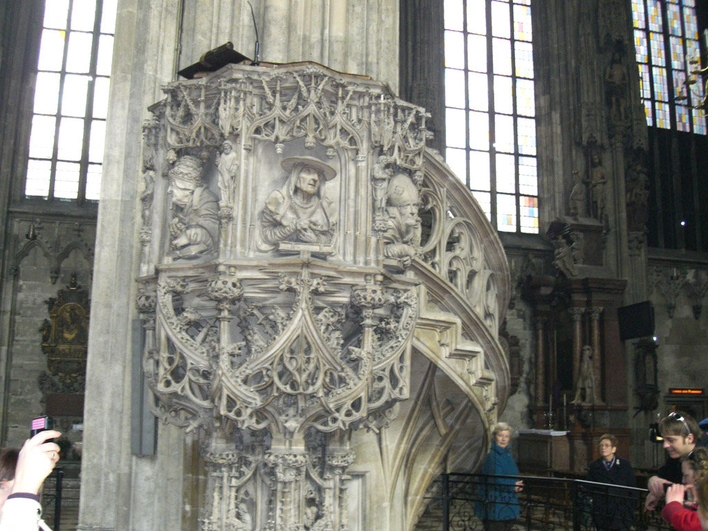 Еще одно восхитительное произведение искусства – это каменная кафедра, созданная А. Пильграмом. На ее перилах мастер разместил небольшие фигурки ящериц и жаб. Такой выбор неслучаен, ибо ящерицы олицетворяют свет, жабы – тьму, следовательно, скрытый смысл композиции – извечное противостояние Добра и Зла. Венчают кафедру портреты четырех основателей католицизма.