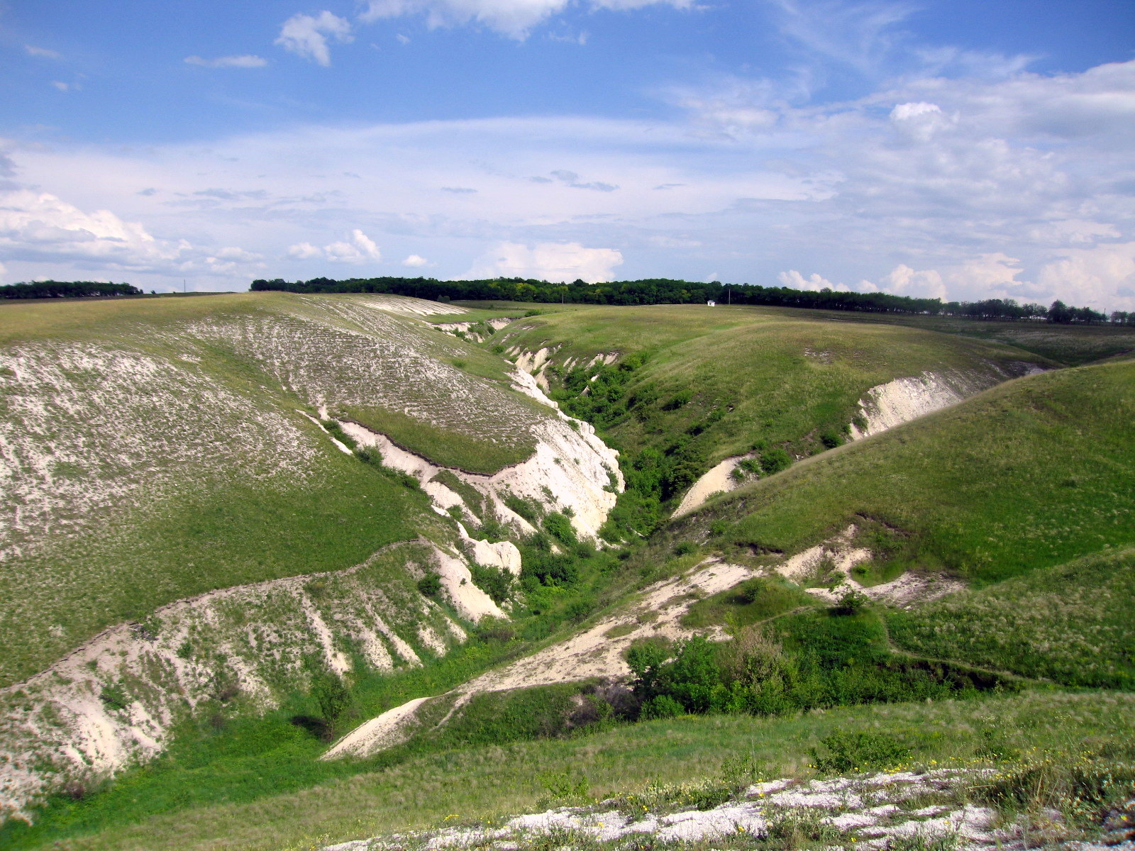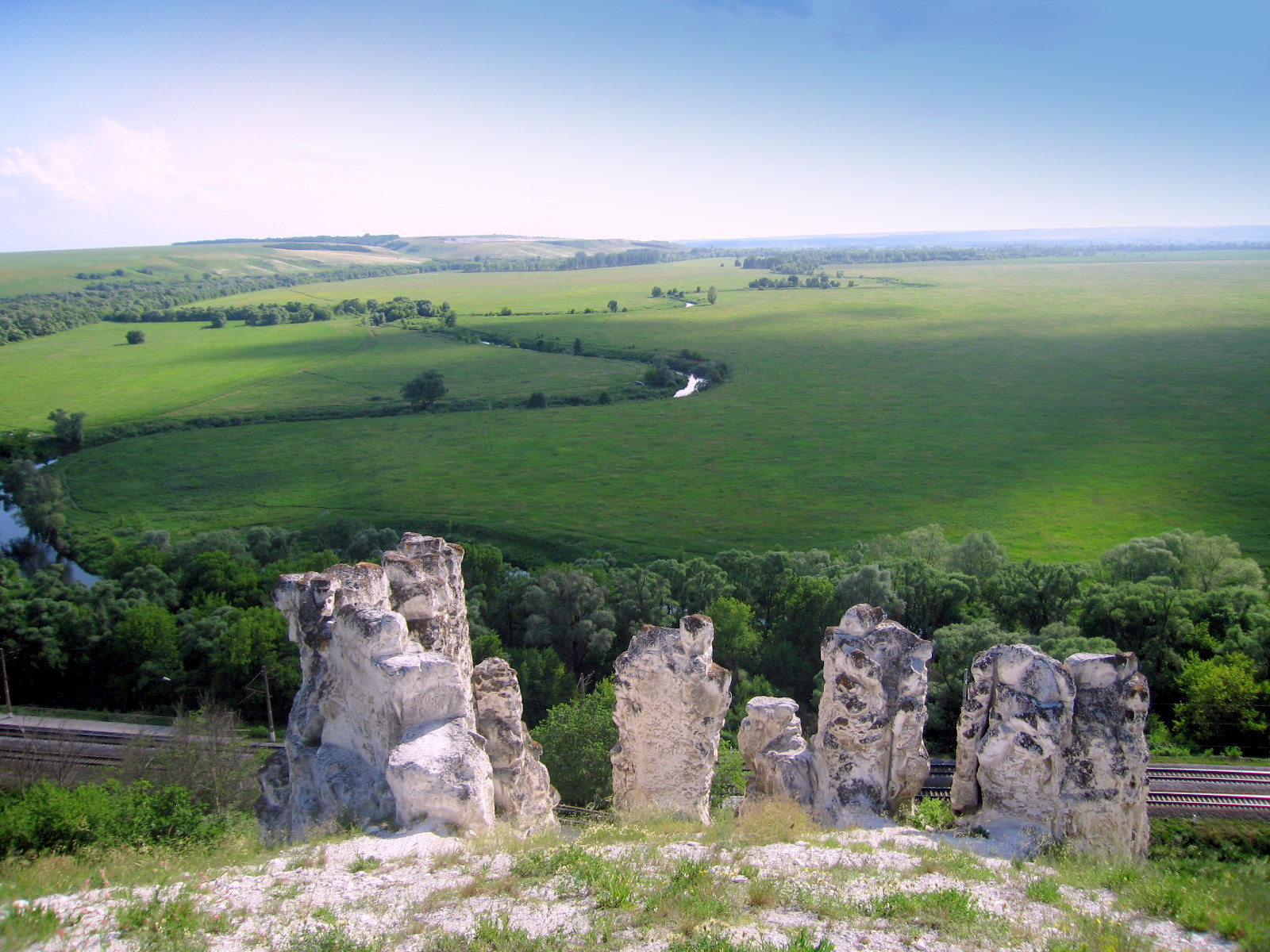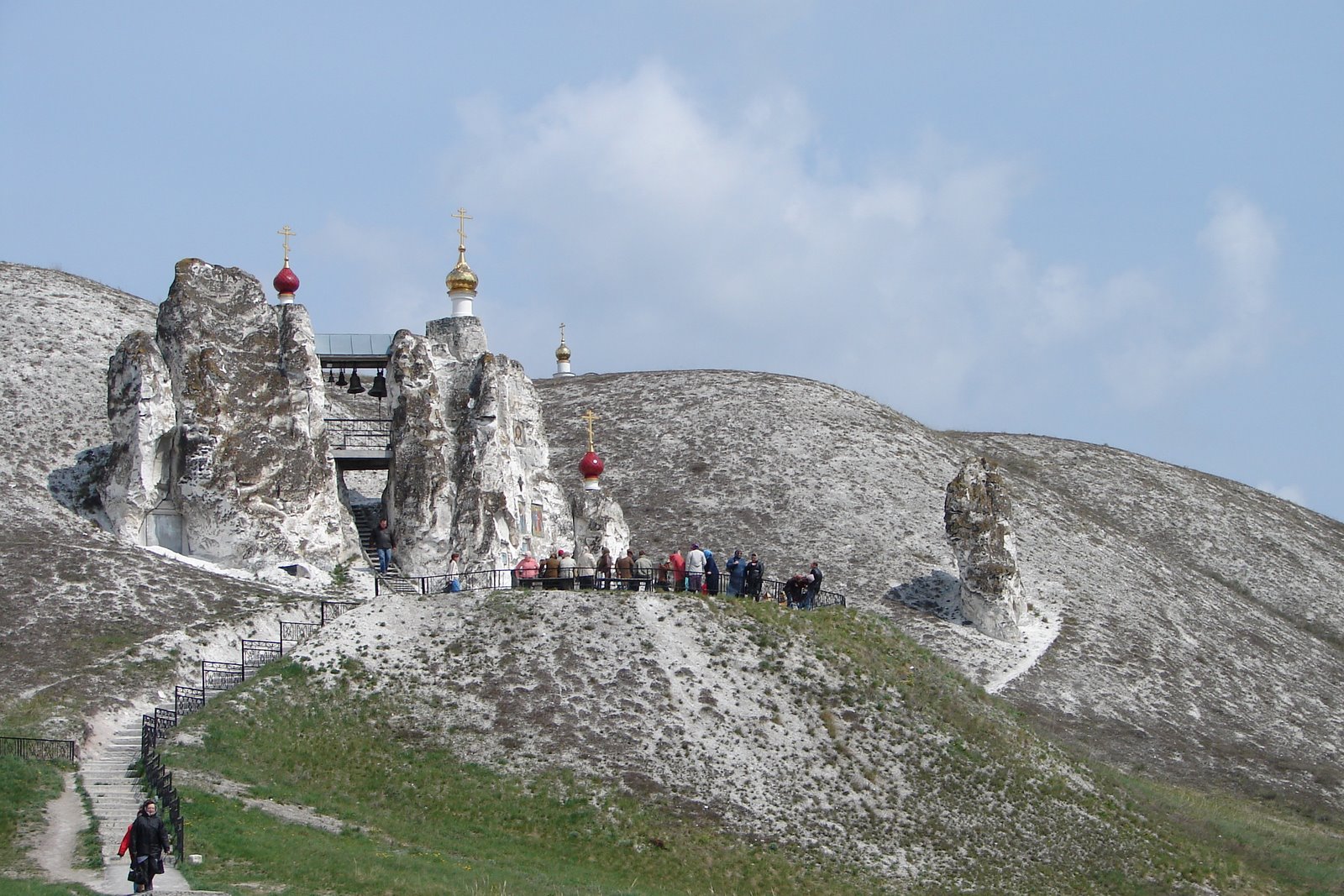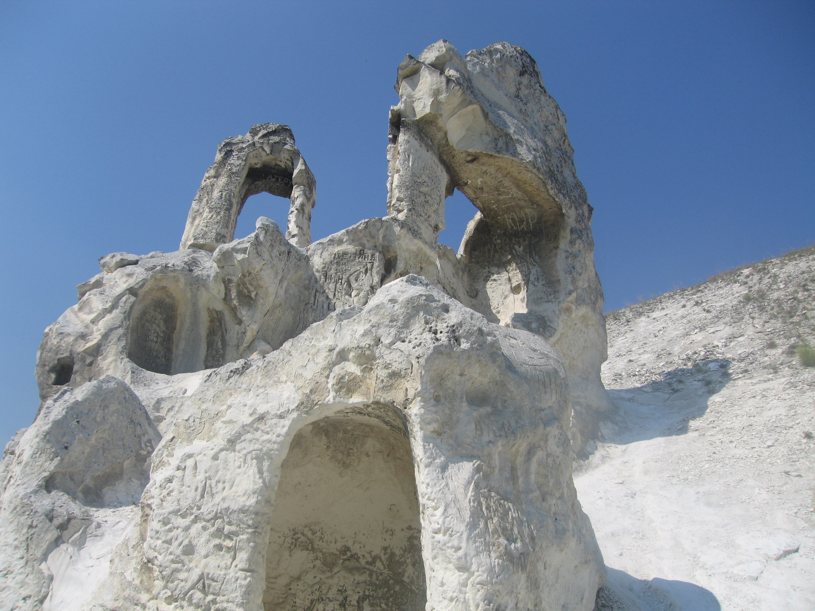 Большой двупрестольный пещерный собор. Перед входом возвышаются меловые, "Богом созданные" столбы - "дивы"