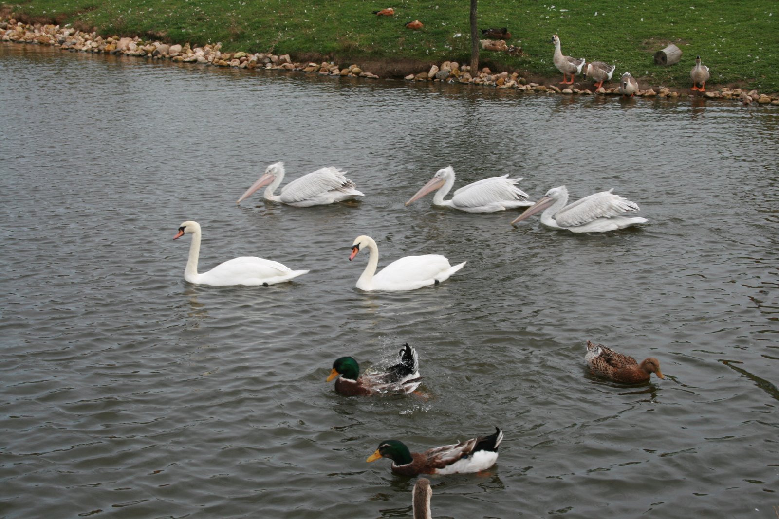 В самом парке очень зелено и живописно. Ландшафт украшают насаждения цветов, кустарников и деревьев, речка, озеро с лебедями, пеликанами, фламинго, утками, искусственные водопадики и каменные гроты.