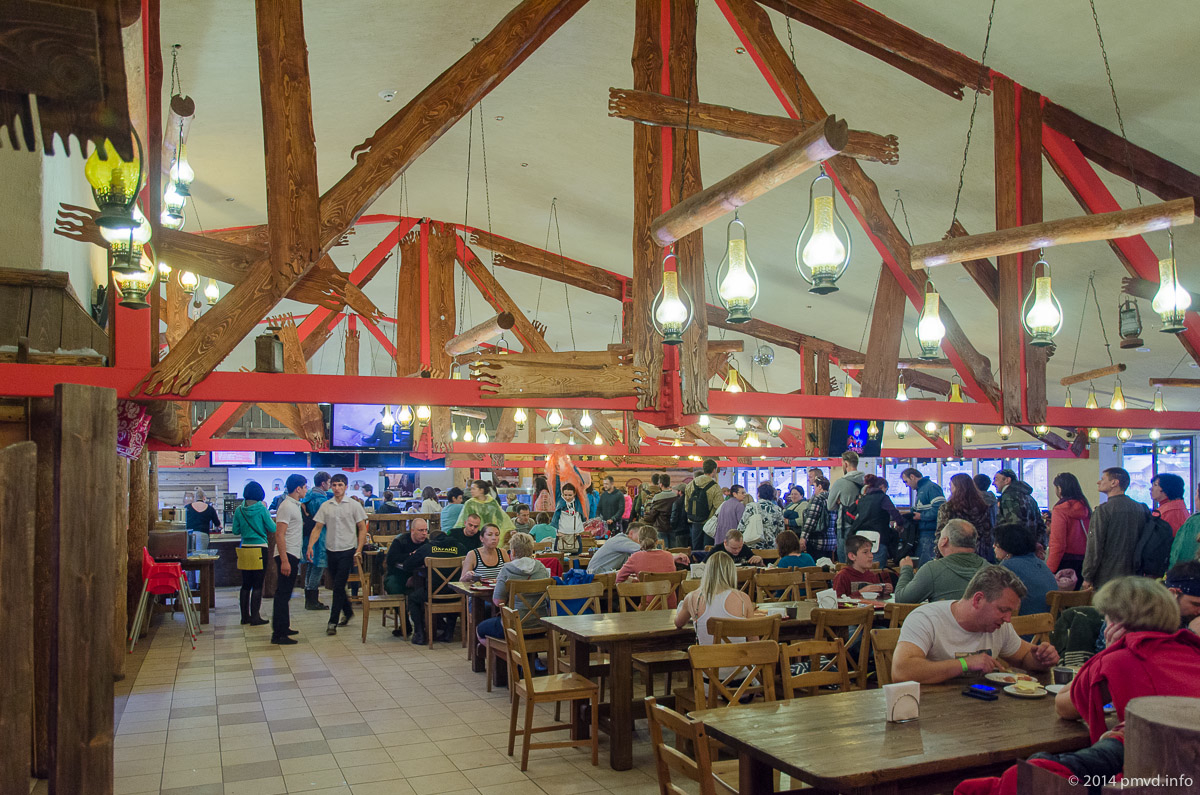 Самый главный и большой ресторан находится на Улице Мира, на втором этаже павильона «Вокруг Света». Его принято называть Трапезной. Все, кто живет в местных отелях, завтракают здесь бесплатно. Его большие помещения оформлены в традиционном русском стиле – деревянная мебель и столы и лаконичный бревенчатый декор. Одновременно здесь может пообедать 600 гостей.