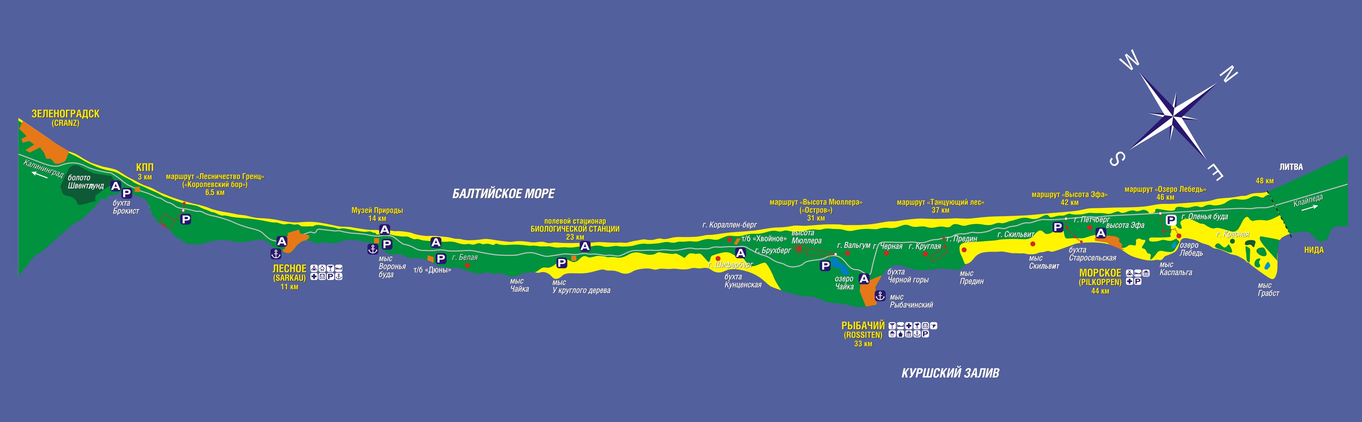 Куршская коса находится в удивительном месте и отделяет воды Куршского залива от Балтийского моря. Здесь расположены и высокие, открытые ветрам песчаные дюны и дикие леса. На территории парка находится богатый и поражающий своим разнообразием животный и растительный мир. На меленькой по своему масштабу местности, имеются совершено непохожие друг от друга пейзажи: озёрные берега, луга, дюны, южная тайга и леса.