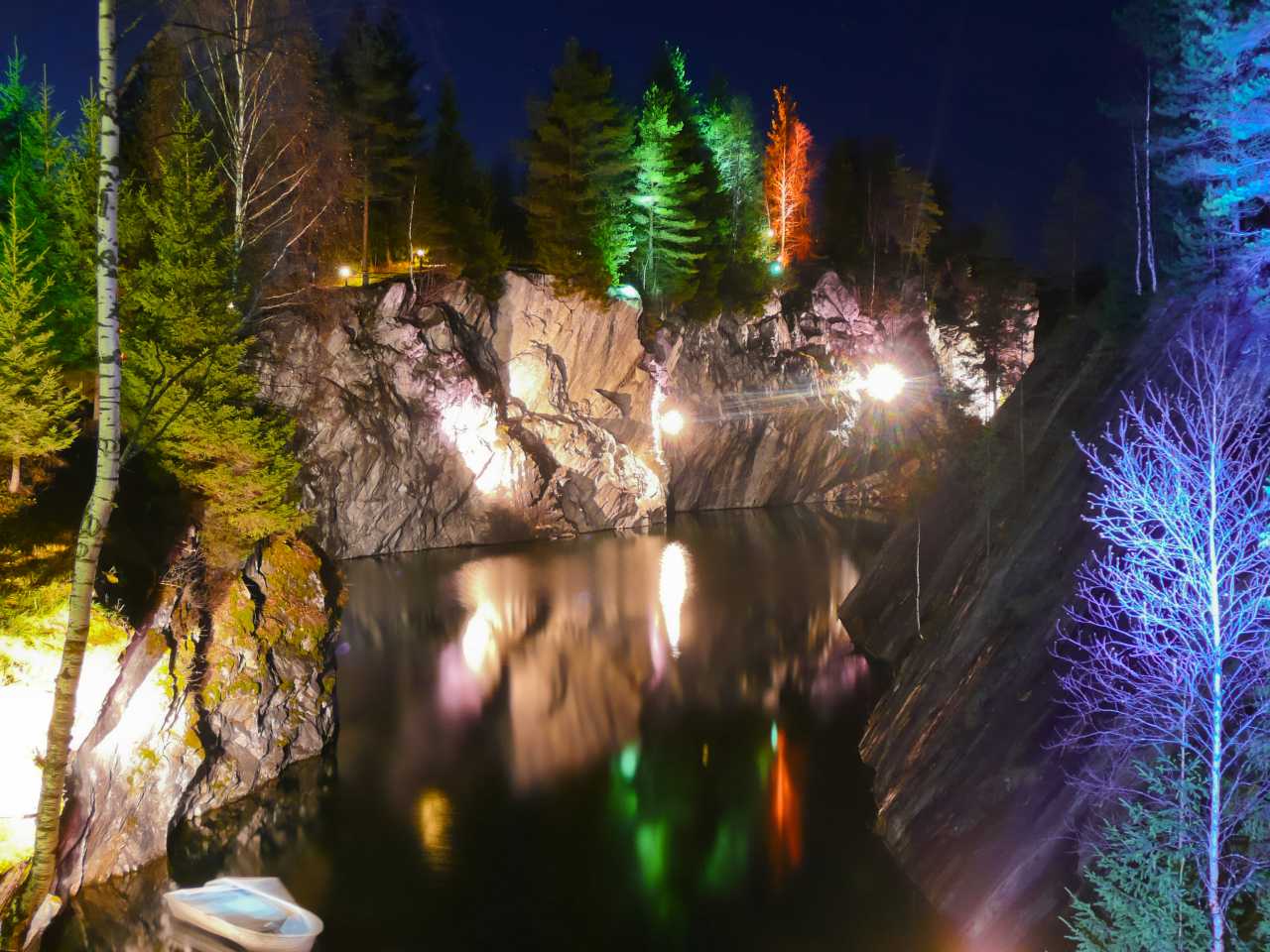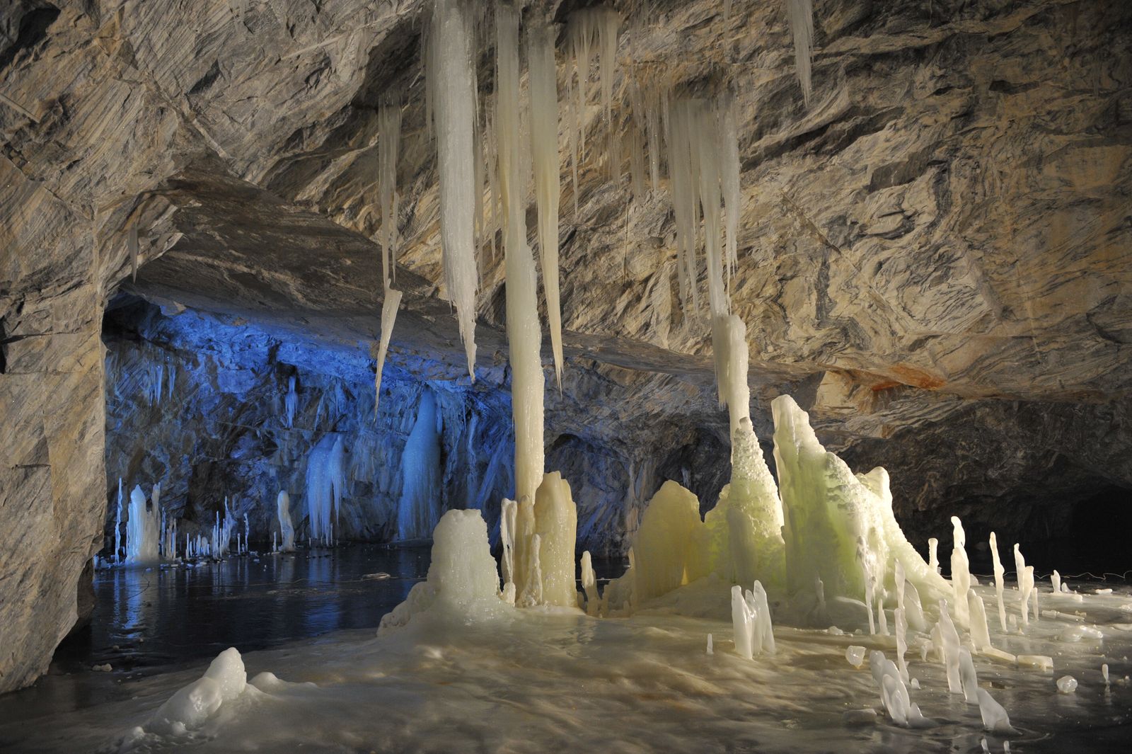 Следует сказать, что в зимнее время «Горный парк Рускеала» не менее привлекателен и удобен для посещения, а сам провал в это время превращается в настоящий «Дворец Снежной Королевы», состоящий из причудливых ледяных глыб, замерзших сталактитов и снеговых шапок. А грамотно выставленная художественная подсветка только подчеркивает подобное впечатление. Подойдя по льду, сковавшему толщу Мраморного озера, можно удобно подобраться прямо к входам в штольни и таинственные гроты, один из которых даже получил название «Музыкального» за особый акустический эффект, который создают его своды.