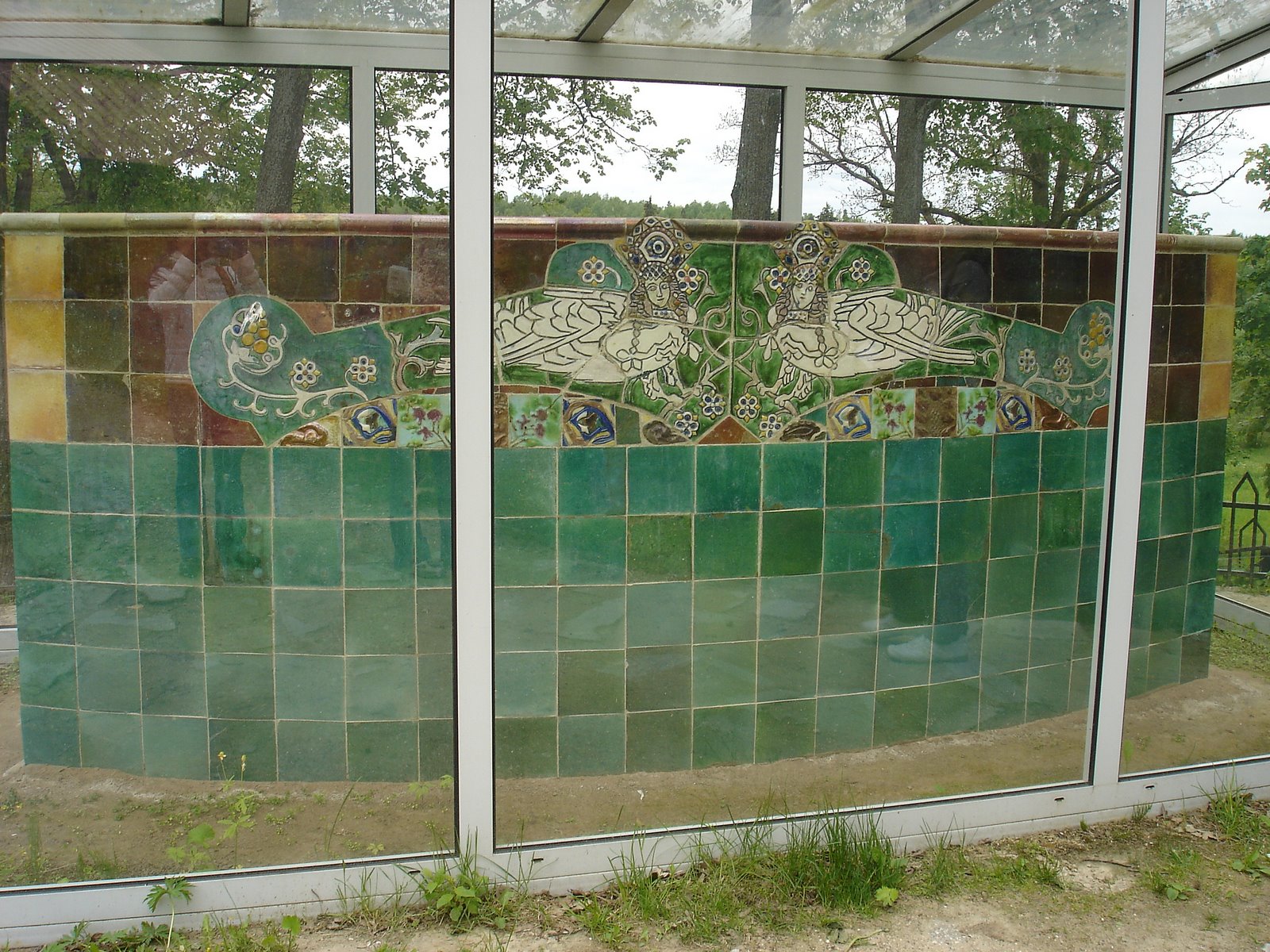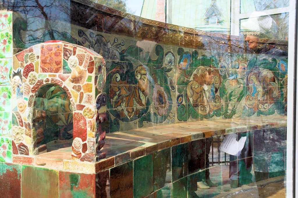 Если спуститься по дорожке, проложенной между мастерской и кухней, мы сможем насладиться цветением алых пионов и полюбоваться созданной Врубелем скамейкой, которую покрывают выполненные вручную изразцы. К сожалению, присесть на скамейку и отдохнуть не выйдет – экспонат настолько ценный, что его поместили в закрытый стеклянный павильон.