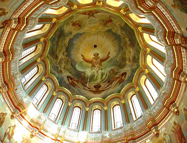 Посмотрев на Храм с высоты птичьего полета, можно увидеть, что он имеет форму креста. Его размеры впечатляют, 85 метров в ширину и чуть более 105 метров в высоту, это делает Храм Христа Спасителя самым большим строением подобного рода. Более 10000 человек могут одновременно присутствовать в храме на службах. Позолоченные купола храма покрыты еще и тончайшим слоем алмазной пыли, который призван защитить их от негативного влияния окружающей среды. Скорее всего, именно благодаря нему, создается впечатление, что от куполов исходит какой-то необычный, сверхъестественный свет.