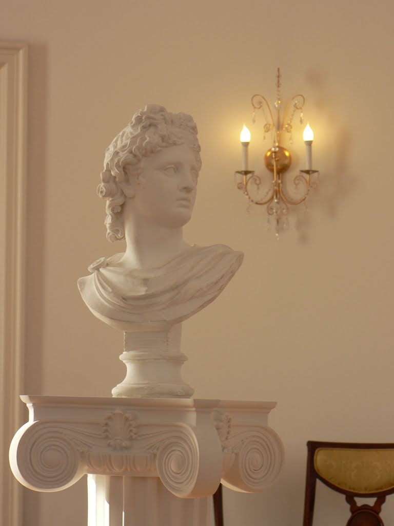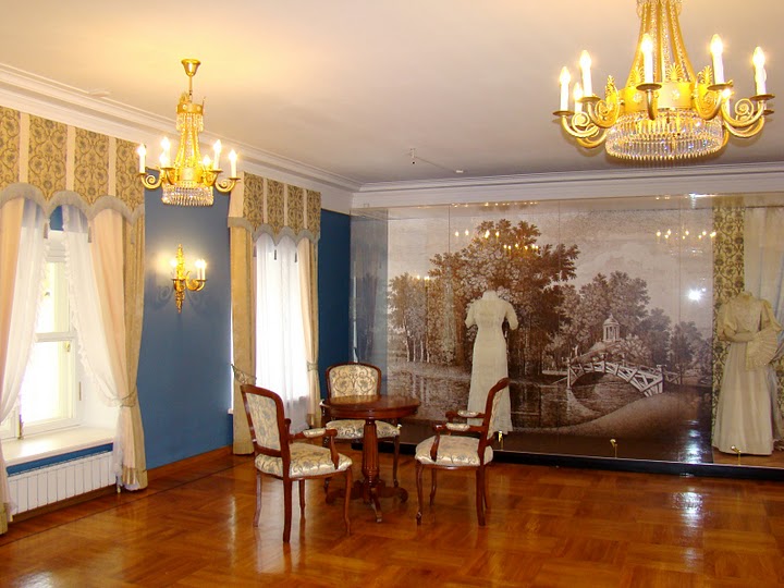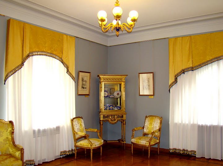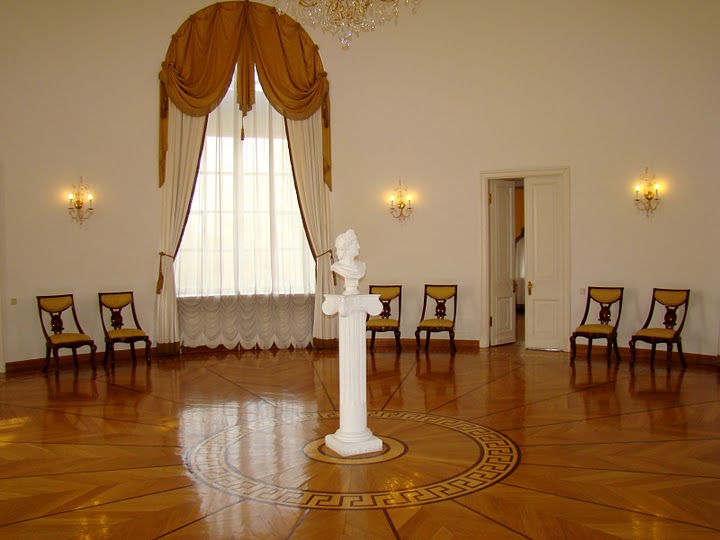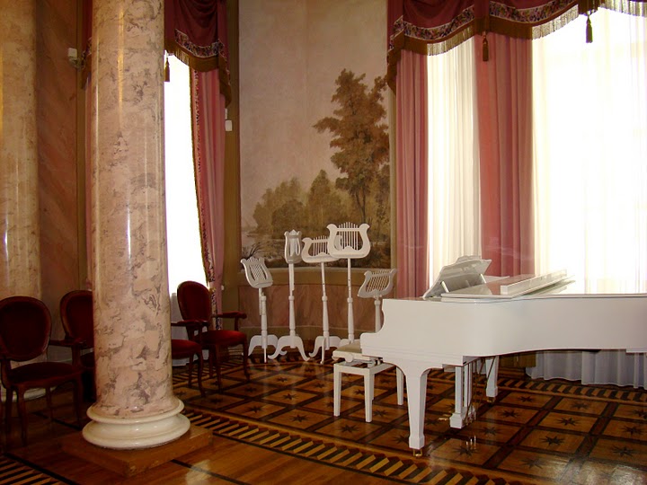 В галерею ведет широкая лестница, а далее следует роскошный Круглый зал, где в былые времена находилась хозяйская столовая. Помещение богато украшено уникальной росписью, выполненной в технике грийзаль, на гладких стенах столовой можно увидеть барельефы, крупные медальоны и фриз, другие декоративные архитектурные детали. Между колоннами прямо в пролетах внутренние стены особняка украшены необычной пейзажной живописью, а у входов в многие залы можно увидеть картины с сюжетами, характерными для античного мира. Особенно впечатляют полотна «Аполлон с музами», «Венчание Амура», «Жертвоприношение», «Феб Лучезарный», написанные живописцем Джермано Скотти.