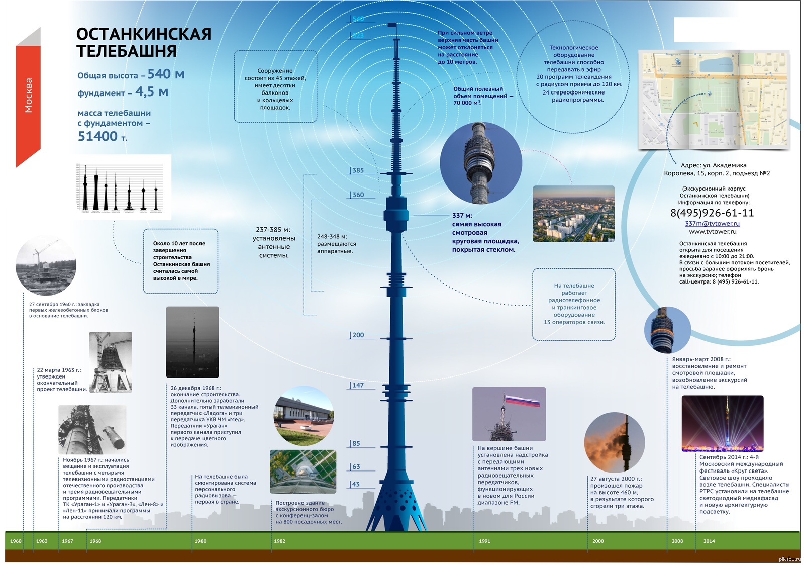 Посещение самого известного телерадиопередающего объекта страны может занять не один час и станет прекрасным дополнением любой экскурсионной программы по Москве.