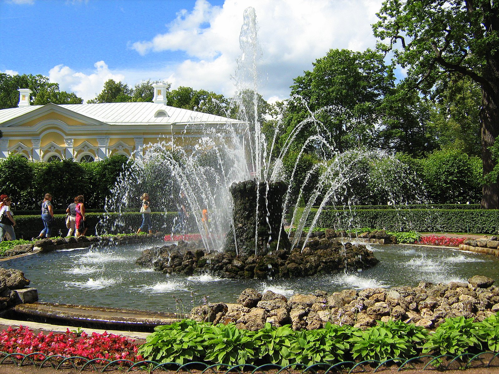 Роскошным ковром расстилается перед дворцом Верхний сад. Первоначальная планировка его была осуществлена в 1714-1724 гг. архитекторами Браунштейном и Леблоном. В Верхнем саду пять фонтанов: 2 фонтана Квадратных прудов, Дубовый, Межеумный и Нептун.