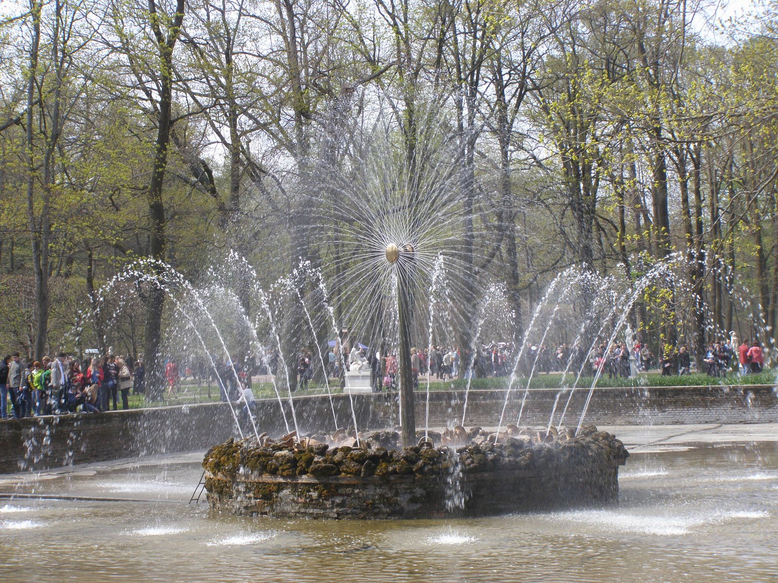 Задуманный, как нескончаемый водный аттракцион, Петергофский парк привлек множество выдающихся мастеров, чья неистощимая фантазия породила вереницу непохожих друг на друга прекрасных фонтанов. В бассейне фонтана "Солнце" жили некогда огромные осетры, доставлявшиеся сюда с Волги. Позднее архитектор Фельтон превратил водоем в купалью. Посередине ее поместил колесо, приводимое в движение водой. Колесо это вертело столб, а диски со 187 отверстиями создали струи водяного светила.