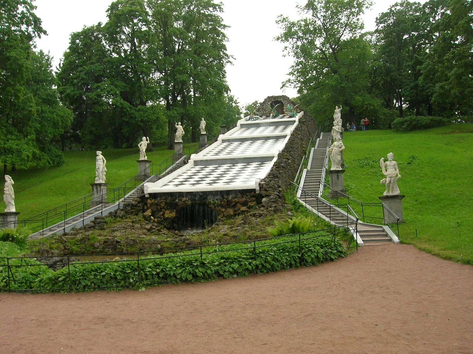 Три диковинных дракона стали на страже ворот, что ведут в верхний грот Шахматной горы, или, как ее иногда называют, каскад Драконов. Высотой более 20 метров, декорированный глыбами известнякового туфа, каскад напоминает дикую скалу, внезапно явившую миру свои скрытые сокровища. Беломраморные аллегорические фигуры — символы морской державы и мифологические персонажи выстроились по сторонам спусковой лестницы. Вода вырывается из пастей драконов, и спускаясь по горе, прикрывает нижний грот. Чтобы увидеть фонтан во всей его красе, на него нужно смотреть только снизу.