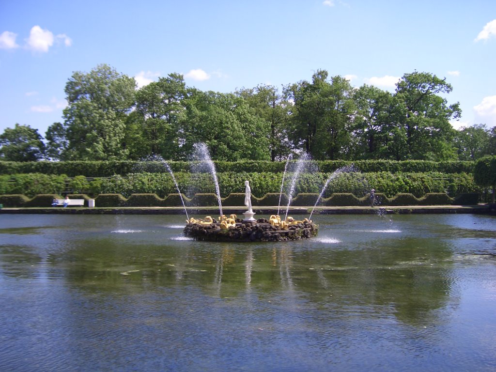 "Собака гонялась за утками на воде. Тогда ей утки сказали тако: — Напрасно ты мучишься, ты силу имеешь нас гнать, только не имеешь силы поймать" — написал на чертежах, что были приложены к макету задуманного им фонтана, мастер М. Земцов. И в 1725 году возник неизменный любимец детворы со времен Петра и до наших дней забавный фонтанчик, названный Фаворитным. Фонтанчик находится в Нижнем саду, позади Воронихинской колоннады). Собачка Фаворитка гоняется по кругу на воде за четырьмя утками, из пасти собачки и клювов уток бьет струйками фонтан. Колокольных дел мастер И. Ферстер подарил зверушкам задорные, до сих пор веселящие публику, голоса. Существует, сохранившаяся до наших дней традиция — кидать монетки на спины спешащих по воде уток. Тому, кто попадет неизменно будет сопутствовать удача, а значит, он снова вернется в этот прекрасный парк.
