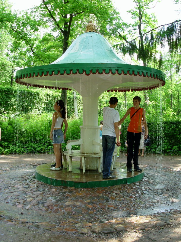 Петергоф не был бы любимым детищем Петра, если бы среди этой красоты не подстерегали публику забавы и сюрпризы. Вот, например, казалось бы заботливая рука радушного хозяина щедро украсила стол всевозможными фруктами, — лишь протяни руку и угостись... И вдруг неожиданно вырвутся на свободу прямо из стола множество веселых струек воды, рождая смех и удивление.